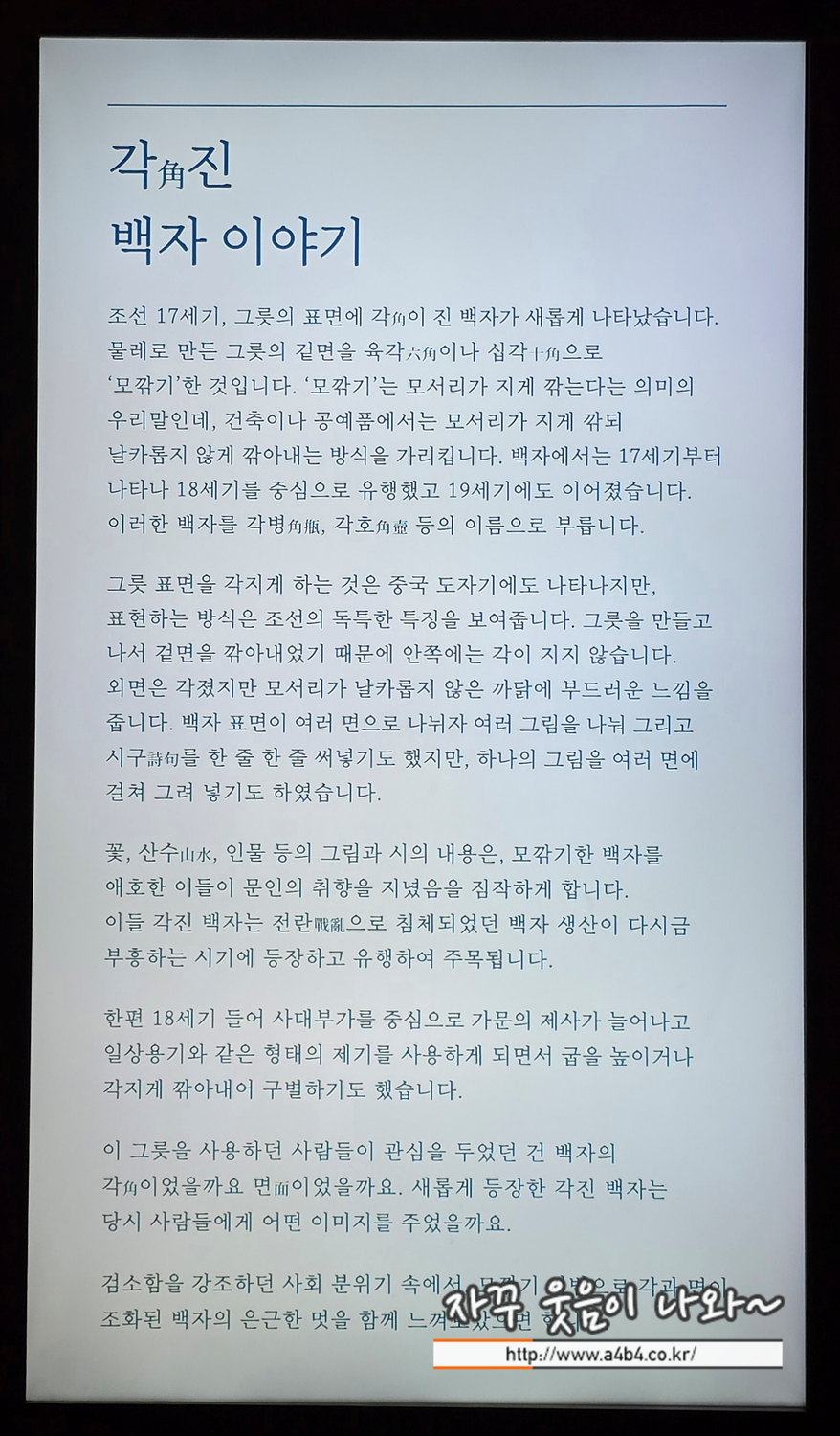 여기까지가 국립중앙박물관 전시회 '각진백자 이야기' 공간입니다.