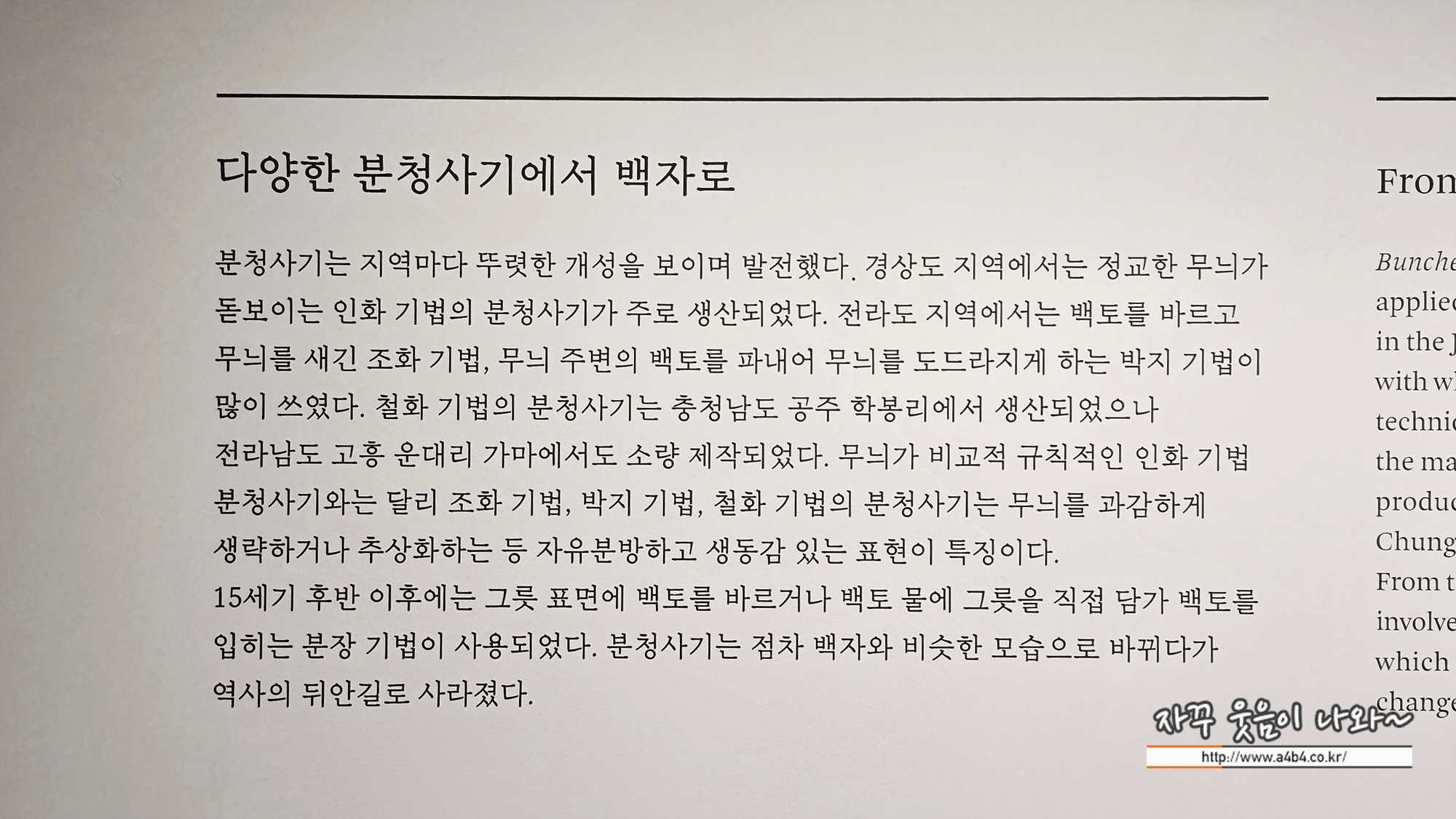 분청사기는 회청색 흙으로 만든 그릇에 백토를 입힌 뒤 여러 기법으로 장식한 도자기로 분청사기는 고려 말 상감청자에서 유래됐으며, 16세기 중엽까지 만들어졌다고합니다.. '분청사기'라는 용어는 미술사가 고유섭(高裕燮, 1905-1944)이 1930년대에 '분청회청사기(粉靑灰靑沙器)'라는 미술사적 용어로 사용되기 시작했고, 백자는 흰 백색의 흙으로 그릇을 만들어 유약을 입힌 다음, 1,300도의 높은 온도에서 구워 낸 도자기입니다. 청자보다 더 우수한 기술로 제작된 백자는 조선시대에 널리 쓰였는데, 조선 백자는 절제미와 우아한 품격을 갖춘 뛰어난 품질의 도자기입니다.