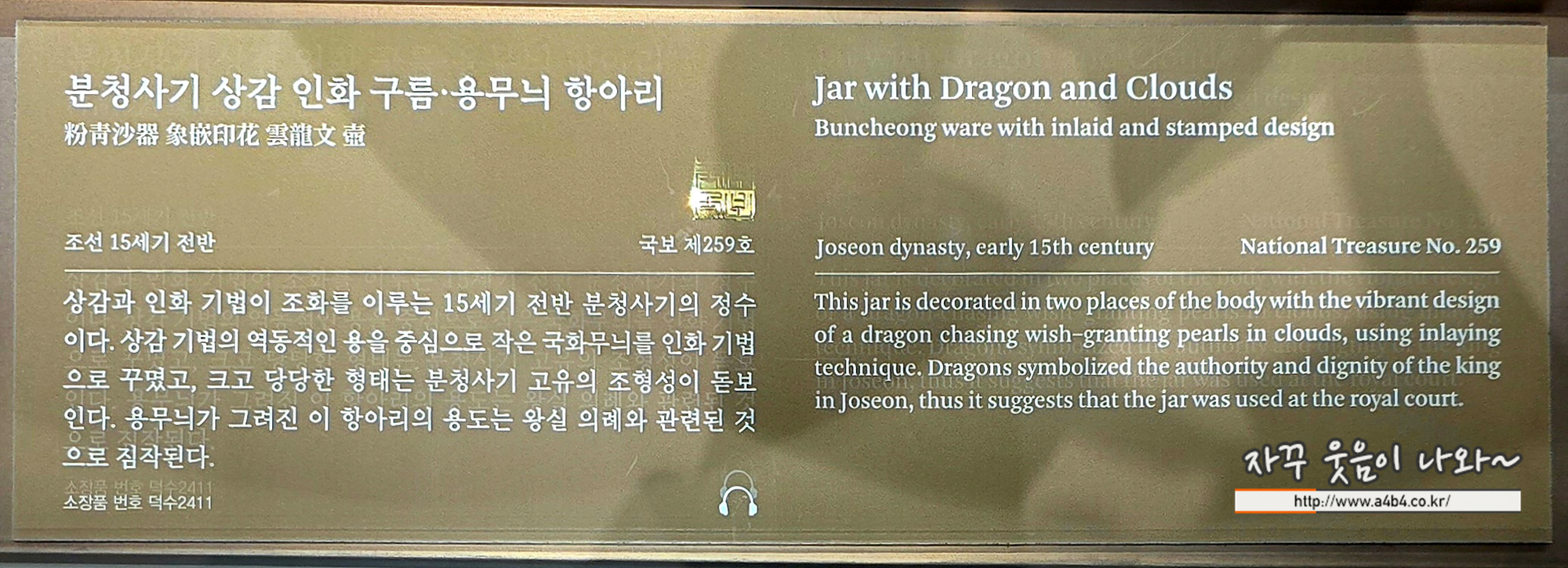 분청사기 상감 구름 용무늬 항아리 (지정문화유산 국보) 국보 분청사기 상감 운룡문 항아리(1991), 粉靑沙器 象嵌 雲龍文 立壺), 粉靑沙器象嵌印花雲龍文壺, 분청사기 상감 인화 운룡문 호 전시명칭 분청사기 상감 인화 구름 용 무늬 항아리 국적/시대 한국 - 조선 / 출토지 경상북도 - 안동시 재질 도자기 - 분청 / 분류 식생활 - 음식기 - 저장운반 - 항아리 크기 높이 48.5cm, 몸통지름 29.7cm 소장품번호 덕수2411