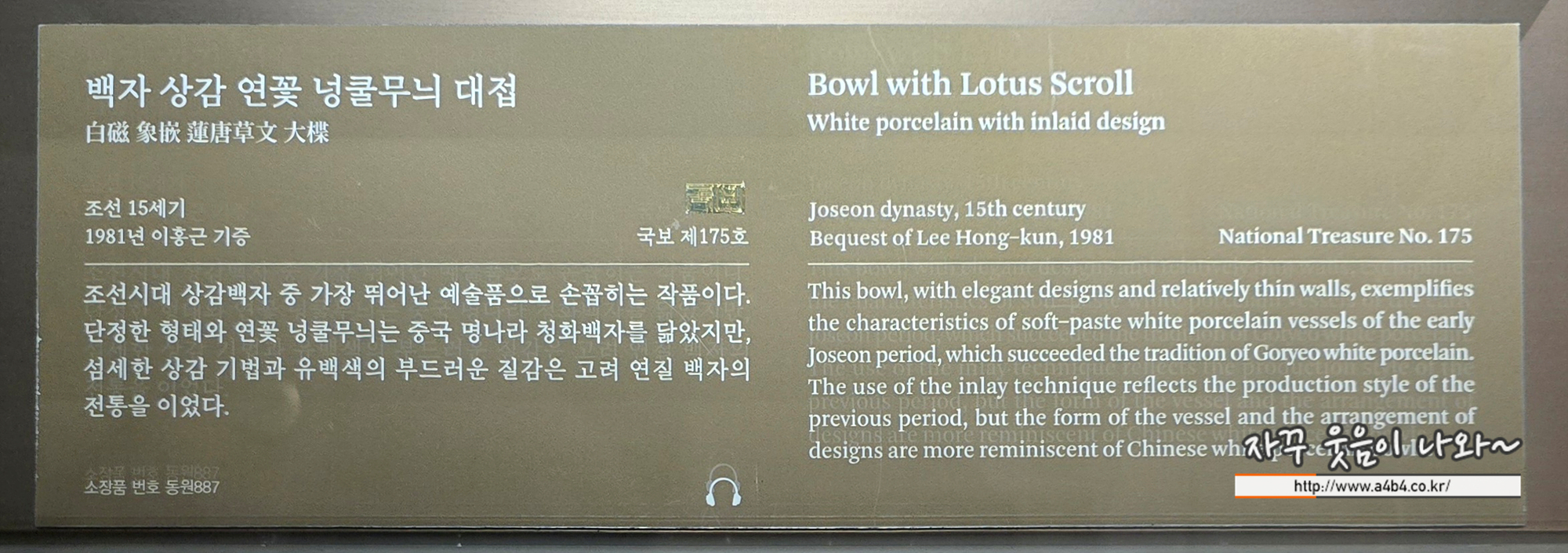 백자 상감 연꽃 넝쿨무늬 대접 (지정문화유산 국보) 다른명칭 국보 백자 상감 연화당초문 대접(1974), 白磁 象嵌蓮花唐草文 大楪, 白磁象嵌蓮唐草文大楪, 백자 상감 연당초문 대접 전시명칭 백자 상감 연꽃 넝쿨무늬 대접 국적/시대 한국 - 조선 / 재질 도자기 - 백자 / 분류 식생활 - 음식기 - 음식 - 대접 크기 높이 7.6cm, 입지름 17.5cm, 바닥지름 6.2cm 소장품번호 동원887