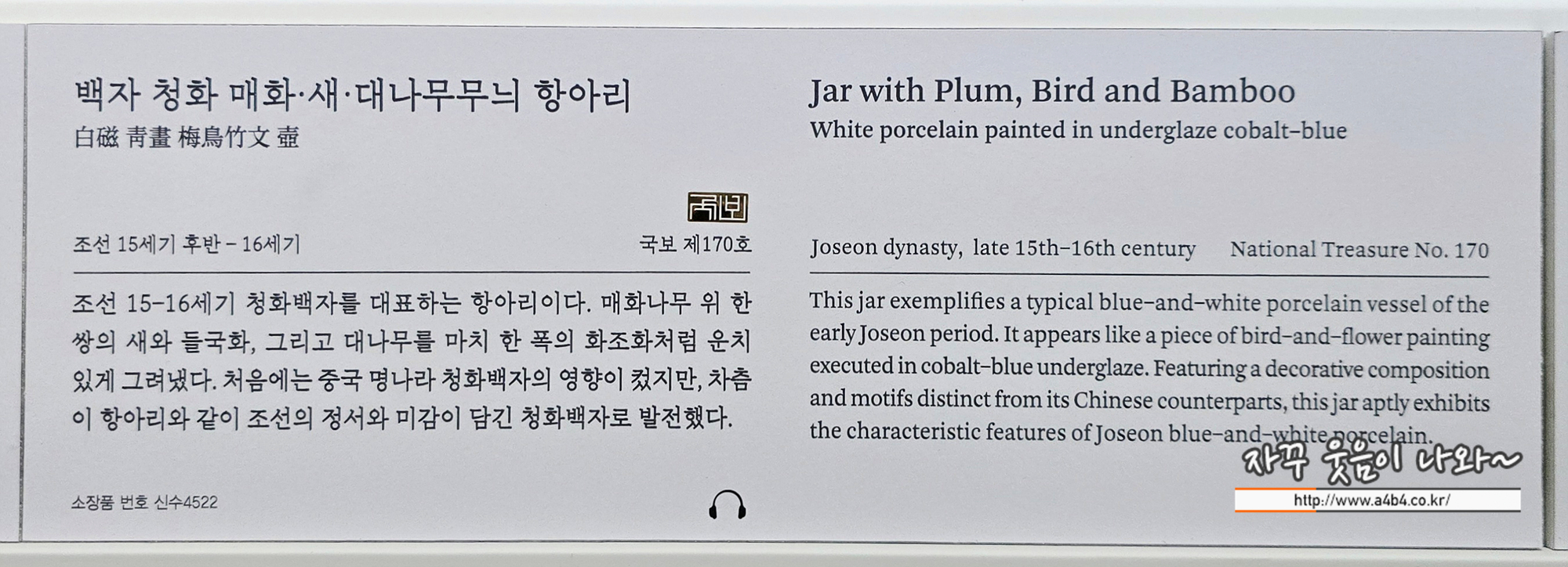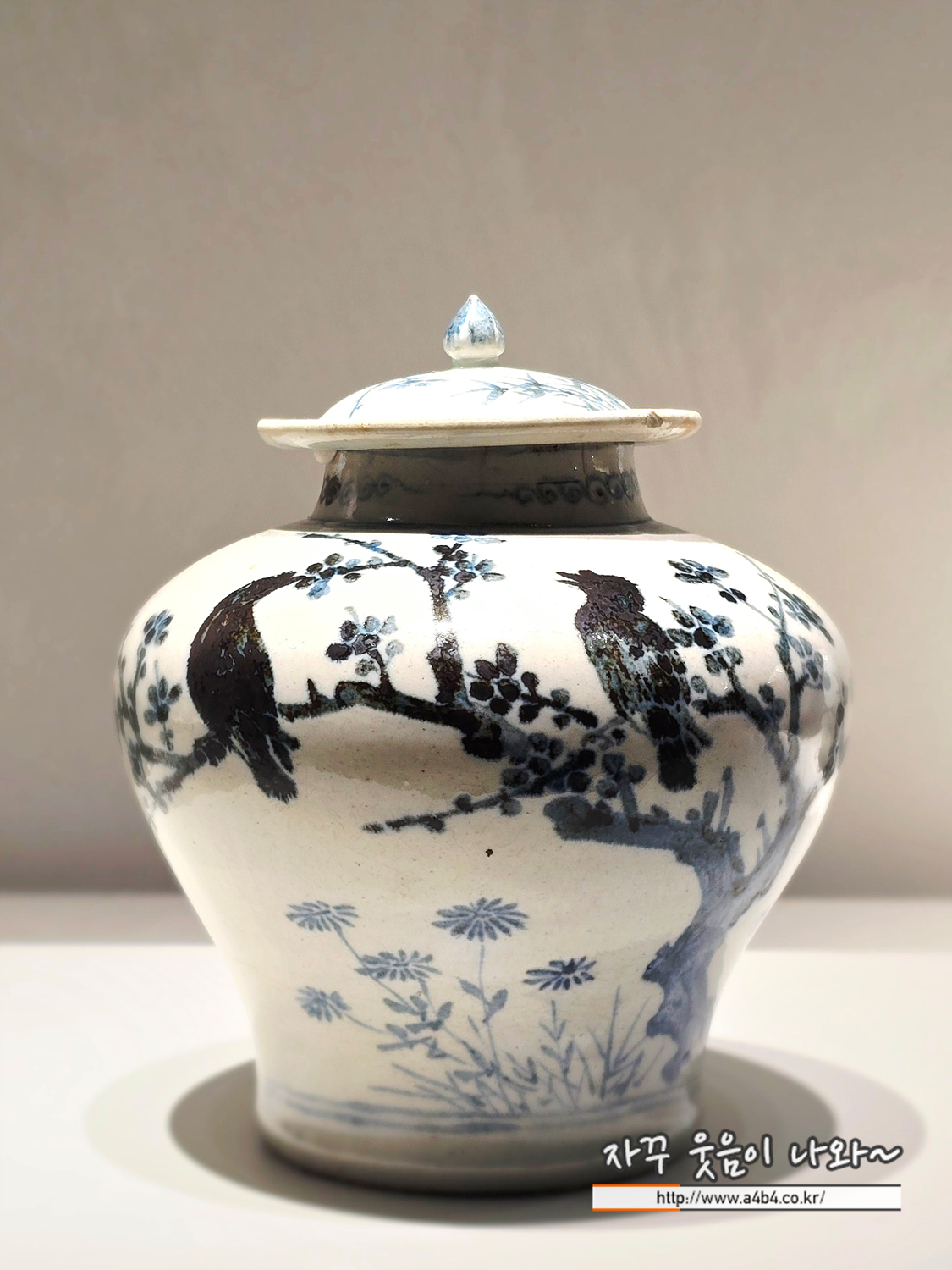 백자 청화 매화 대나무 새 무늬 항아리 ( 지정문화유산 국보) 다른명칭 국보 백자 청화매조죽문 유개항아리(1974), 白磁 靑畵梅鳥竹文 有蓋壺, 백자 청화 매조 죽문호 전시명칭 백자 청화 매화 새 대나무무늬 항아리 국적/시대 한국 - 조선 / 재질 도자기 - 백자 분류 식생활 - 음식기 - 저장운반 - 항아리 크기 높이 16.5cm, 입지름 6.2cm 소장품번호 신수4522