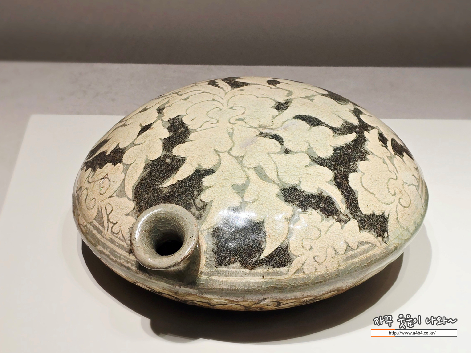 자라를 닮은 모습 때문에 자라병이라 불리는 이 병은 끈을 매어 휴대할 수 있도록 제작되어 여행용 물병이나 술병으로 사용되었을 것으로 추정됩니다. 주로 옹기로 만든 생활용기이기 때문에 분청사기나 백자로 된 것은 드물다. 이 자라병은 몸체 바탕에 백토를 씌워 희게 분장한 후, 모란 무늬를 그리고 바탕을 칼로 긁어 무늬가 도드라지게 표현하였습니다. 긁어낸 바탕에는 철분이 많은 안료를 덧발라 구워 검은빛을 내어 모란꽃이 더욱 또렷하게 보이는 시각적 효과를 높였습니다. 대담하고 활발한 모란 구성과 여백을 메운 흑갈색 철채 장식이 어우러져 독특한 분위기를 잘 드러냅니다. 같은 시대 백자에도 자라병이 간혹 보이지만, 이 병처럼 낮고 원형의 두 면을 위아래로 맞붙여 완성한 형태는 흔하지 않다고합니다.