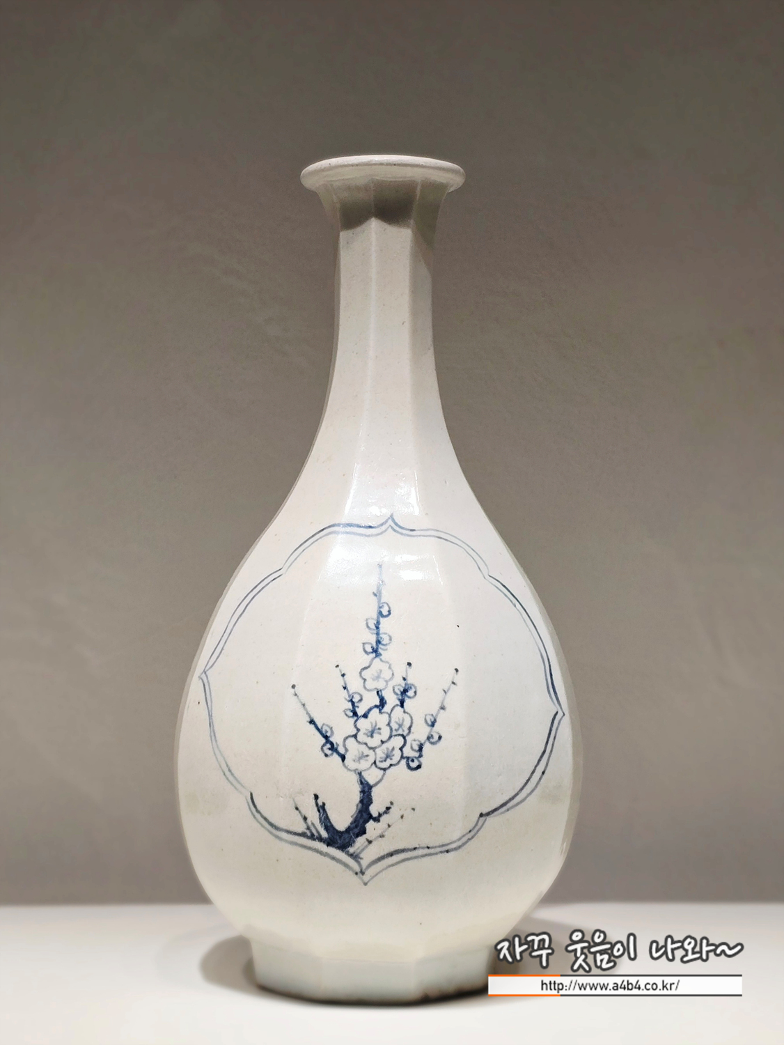 시가 쓰여진 백자 청화 매화 무늬 각병 전시명칭 백자 청화 매화무늬 병 국적/시대 한국 - 조선 / 재질 도자기 - 백자 분류 식생활 - 음식기 - 음식 - 병 크기 높이 39.4cm, 입지름 7.7cm 소장품번호 덕수1138