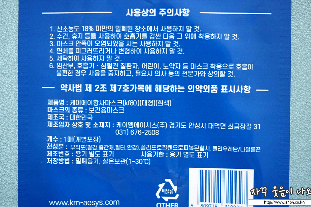 식품의약품안전처 등록 제품명은 '케이에이 황사마크 KF80'입니다. 흰색 대형제품으로 작년 6월 승인된 제품입니다. 마스크 제조사는 케이엠에이시스(주)로 작년같은 달에 승인된 업체입니다. 이외에도 케이에이 브랜드로 Kf-94, KF-AD 마스크를 생산하고 있습니다.