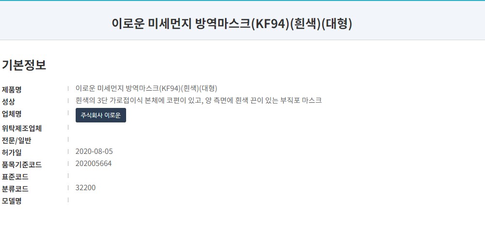 식품의약품안전처 등록명칭은 '이로운 미세먼지 방역마스크' 입니다. KF94 타입의 대형, 흰색 색상의 마스크로 작년 8월에 허가된 제품입니다. 마스크 제조사는 주식회사 이로운.