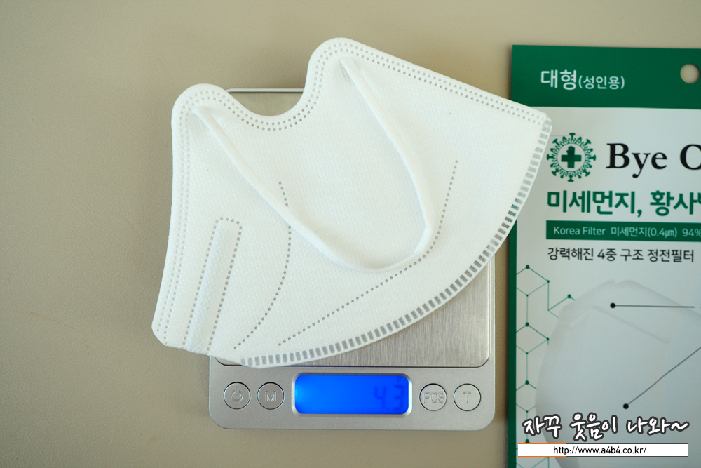 바이코 KF94 마스크 대형 무게는 4.3그램으로 다른 대형사이즈 마스크에 비해 조금 가벼운 무게를 보입니다.