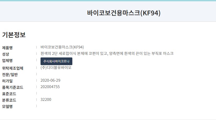 식약처 등록 제품명칭은 '바이코보건용 마스크 Kf94'입니다. 흰색 대형사이즈 마스크로 식약처 허가일은 작년 6월로 등록되어 있습니다. 마스크 제조사는 디더블유바이오, 판매사는 주식회사바이코로나 입니다. 확인시점에는 해당 제품 한 가지만 생산 및 판매하고 있습니다.
