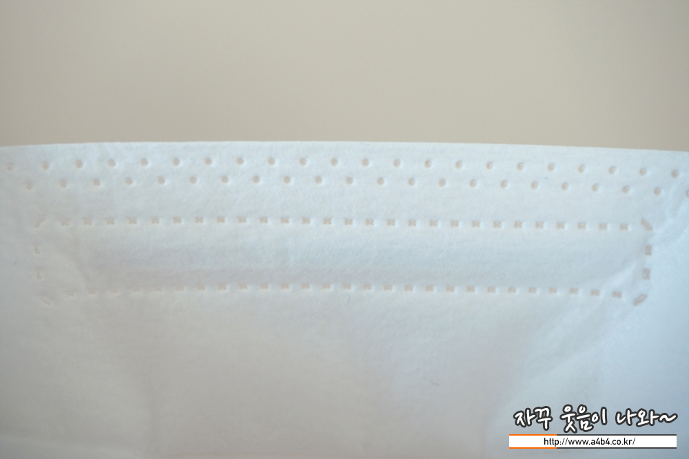 KF94 키퍼미골드 마스크 안감은 드라이한 감촉을 보여주는 부직포가 사용 되었습니다. 안감에 보푸라기가 약간 보이는데요. 저의 기준으로는 하루종일 착용하고 있었지만 볼이나 코 부분이 간지럽거나 가려운 피부트러블은 생기지 않았습니다.