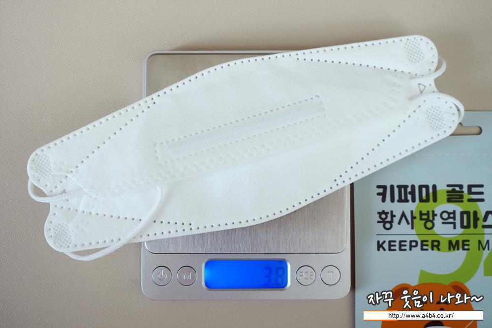 마스크 중량은 3.8그램으로 타사의 KF94 대형 마스크와 비교하면 매우 가벼운 중량을 보여줍니다. 10%이상 가벼운...