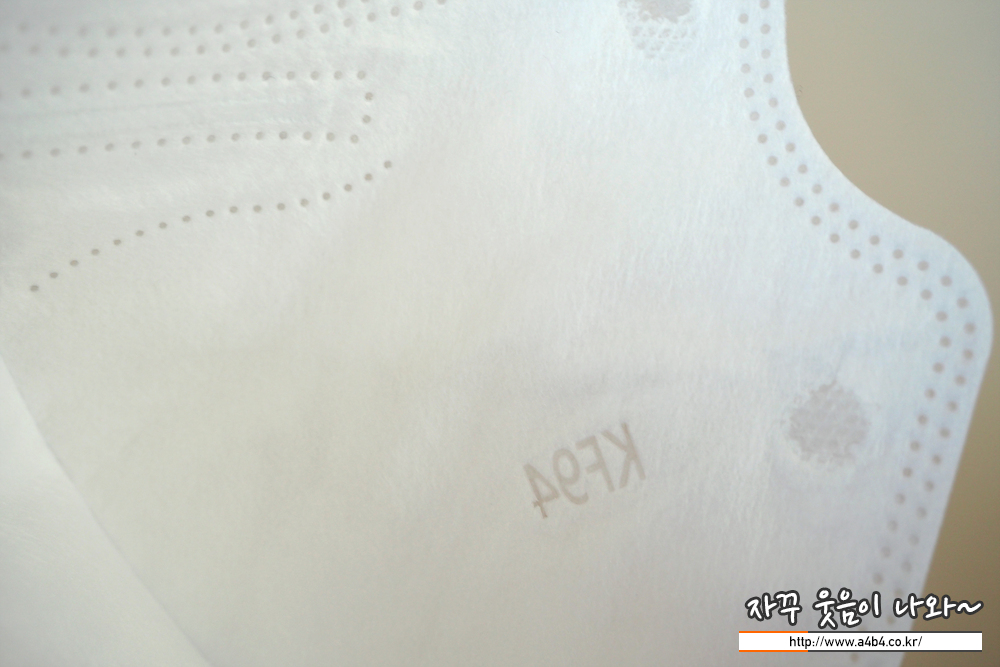 마스크 외관에는 코지지대 부분에 물결무늬 점선이 있는데 이 디자인 또한 많은 새부리형 제품에서 볼 수 있는 디자인입니다. 마스크 외피에는 올웨이즈 마스크 타입인 KF-94 글씨가 각인되어 있습니다. (개인적인 생각으로는 이런 각인이 제품의 수준을 낮춘다는 느낌을...)