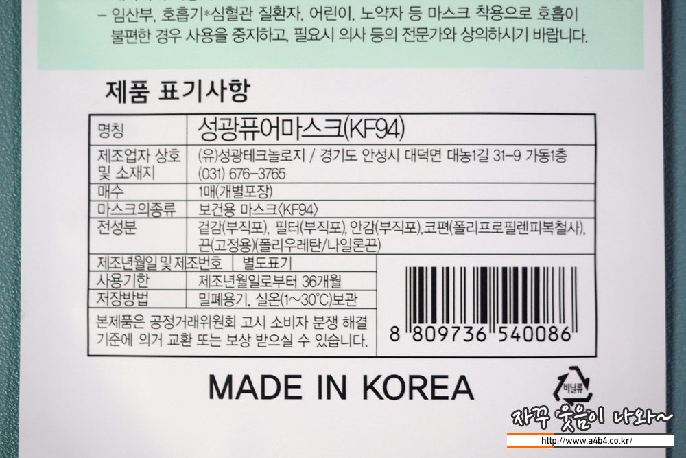 가성비 좋은 성광퓨어 KF94 마스크 착용감 및 사이즈 리뷰