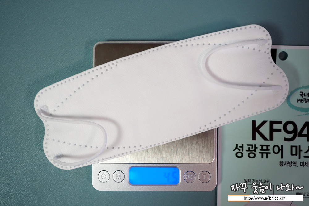 성광퓨어 KF94 마스크 대형 중량은 4.5g으로 타사의 대형 삼단접이식 마스크 무게와 비슷합니다.