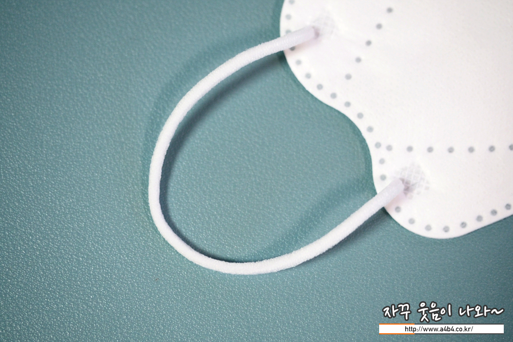 일반적으로 삼단접이식 입체형 마스크에서 많이 사용되는 원형의 귀걸이끈이 앞부분에 부착되어 있습니다. 귀걸이끈 탄력은 약간 강한 수준을 보여줍니다.