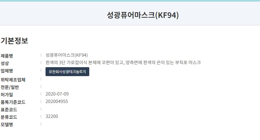 식품의약품안전처 의약품안전나라 등록명칭은 '성광퓨어마스크 Kf94'입니다. 사이즈는 대형 색상은 흰색, 작년 7월 승인된 마스크로 제조사는 '유한회사 성광테크놀로지'입니다.