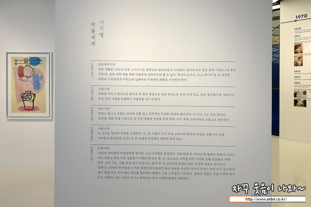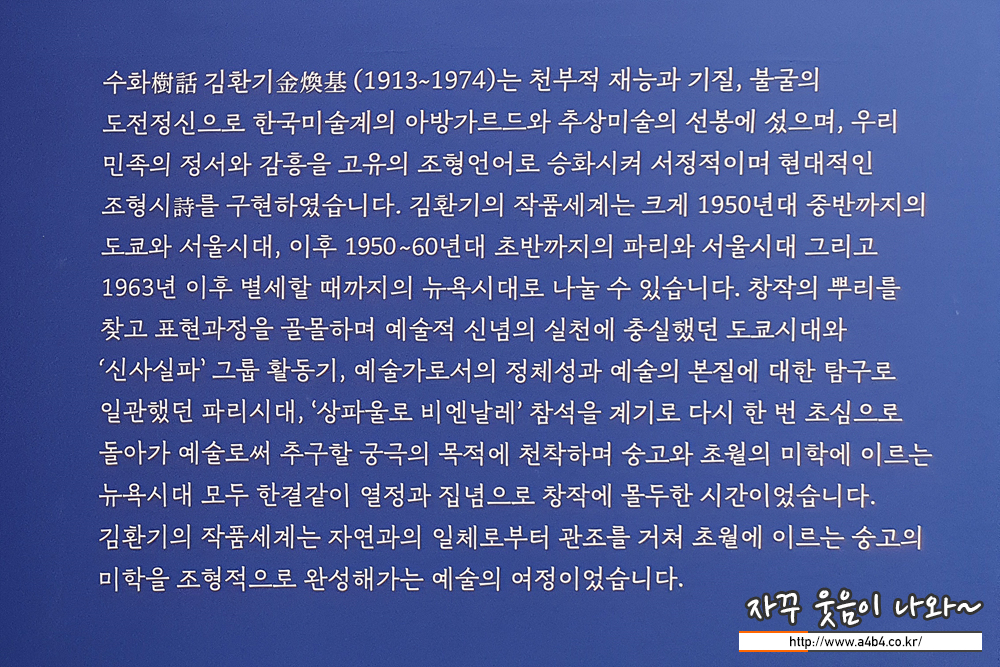 김환기 화백의 작품 초기부터 그의 대표작이 나오게 된 후기까지 많은 작품은 아니지만 그의 작품 흐름을 이해할 수 있도록 잘 구성되어 있습니다.
