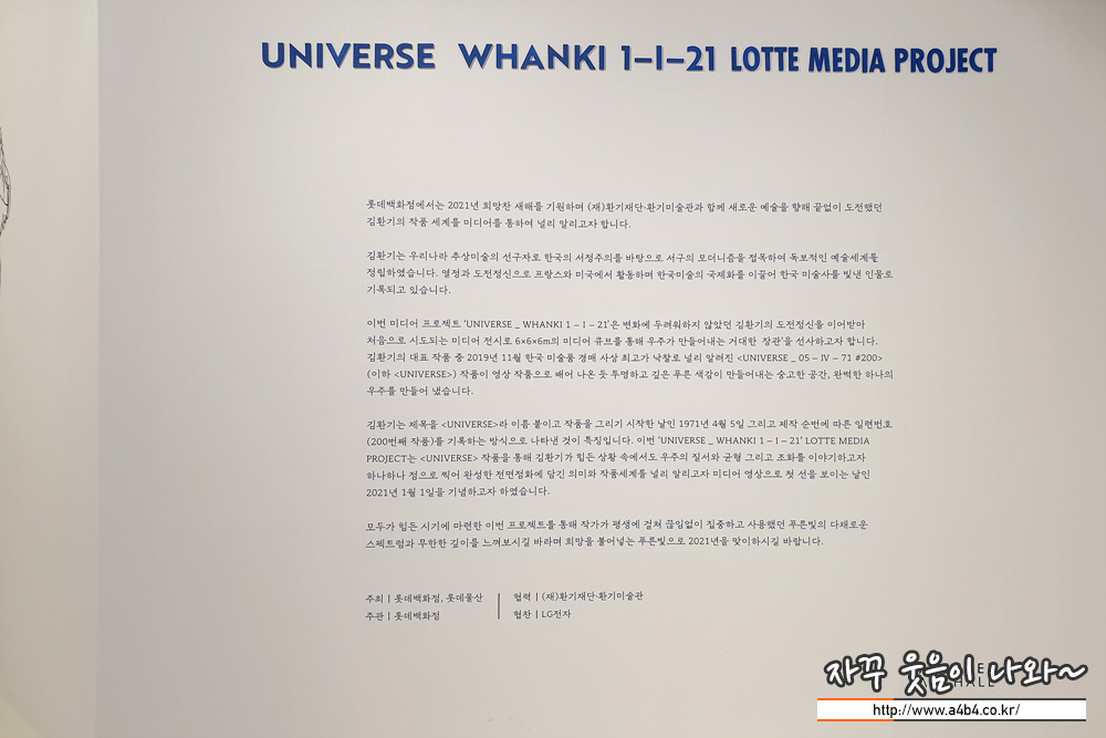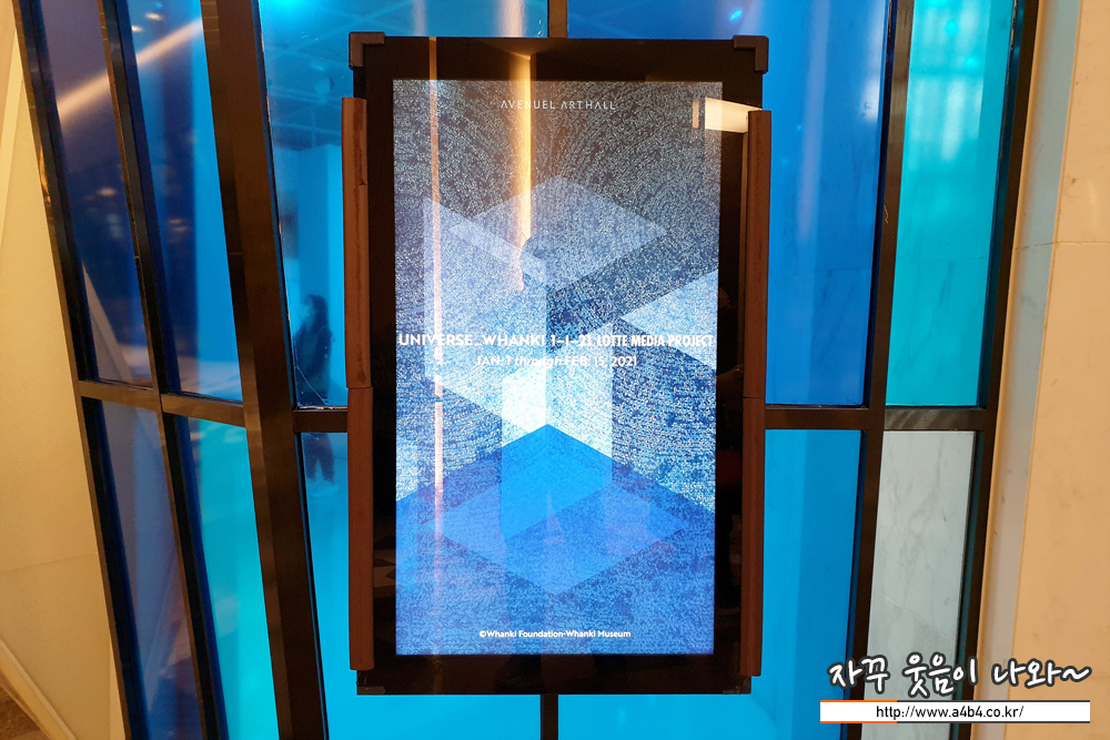 장소는 작지만 항상 흥미롭고 새로운 전시회를 진행하고 있는 잠실 롯데월드타워 에비뉴엘 아트홀에서 열리고 있는 김환기 화백 전시회 'UNIVERSE_WHANKI 1-I-21 LOTTE MEDIA PROJECT' 전시회가 열리고 있습니다.