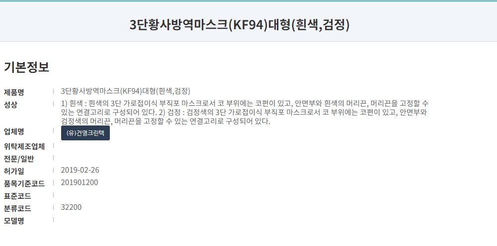 식품의약품 안전처 의약품안전나라 등록명은 '3단 황사방역마스크' Kf94 타입 대형 사이즈 입니다. 오늘리뷰할 색상을 블랙 색상입니다. 제작년인 19년 2월 허가된 마스크로 마스크 제조사는 유한회사 건영크린텍입니다.