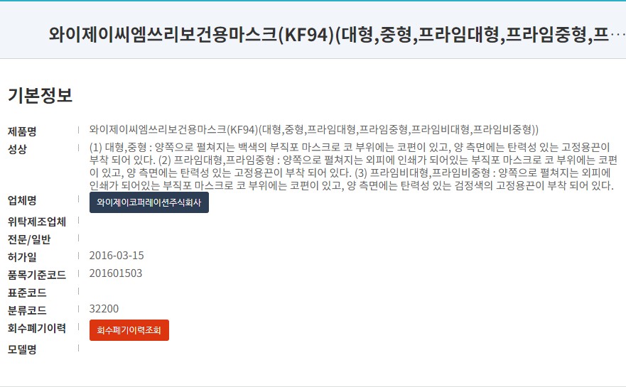 제품명 와이제이씨엠쓰리보건용마스크(KF94)(대형,중형,프라임대형,프라임중형,프라임비대형,프라임비중형))