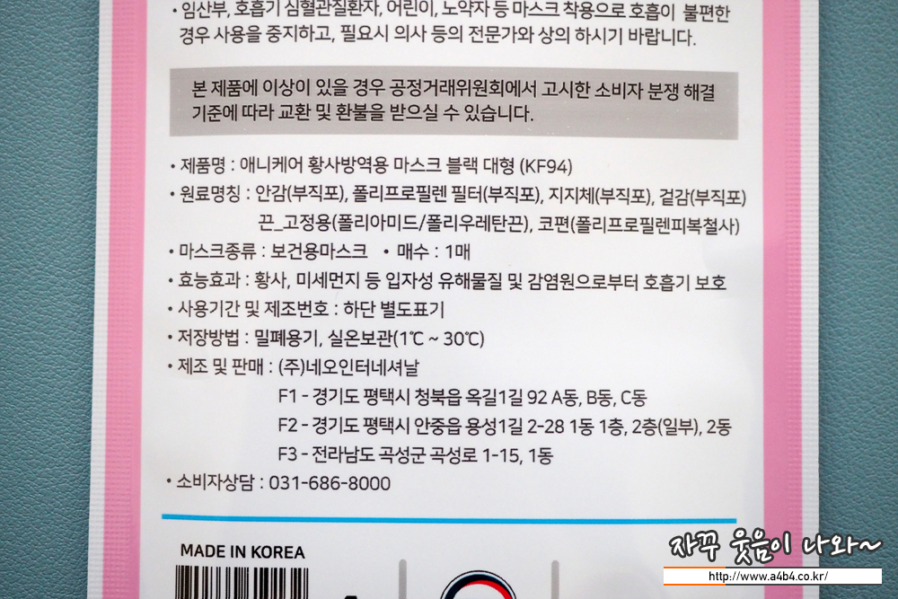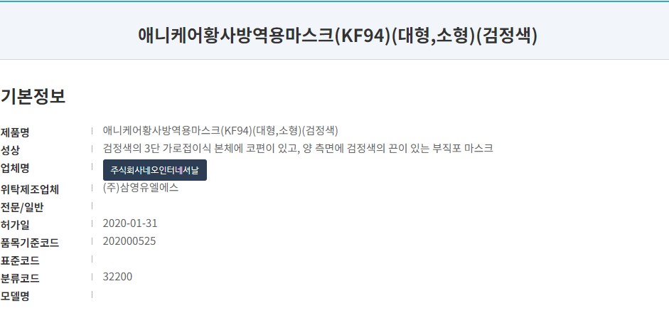 식품의약품안전처 의약품안전나라 등록 정보는 '애니케어 황사방역용마스크 블랙 대형'입니다. KF94 타입으로 작년 1월에 승인된 제품입니다. 제조사는 주식회사 네오인터네셔널로 등록되어있습니다. 식약처 등록 내용은 리뷰 하단에 자세하게 설명되어 있습니다