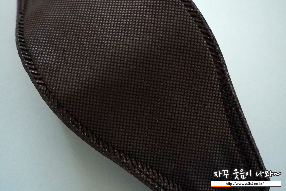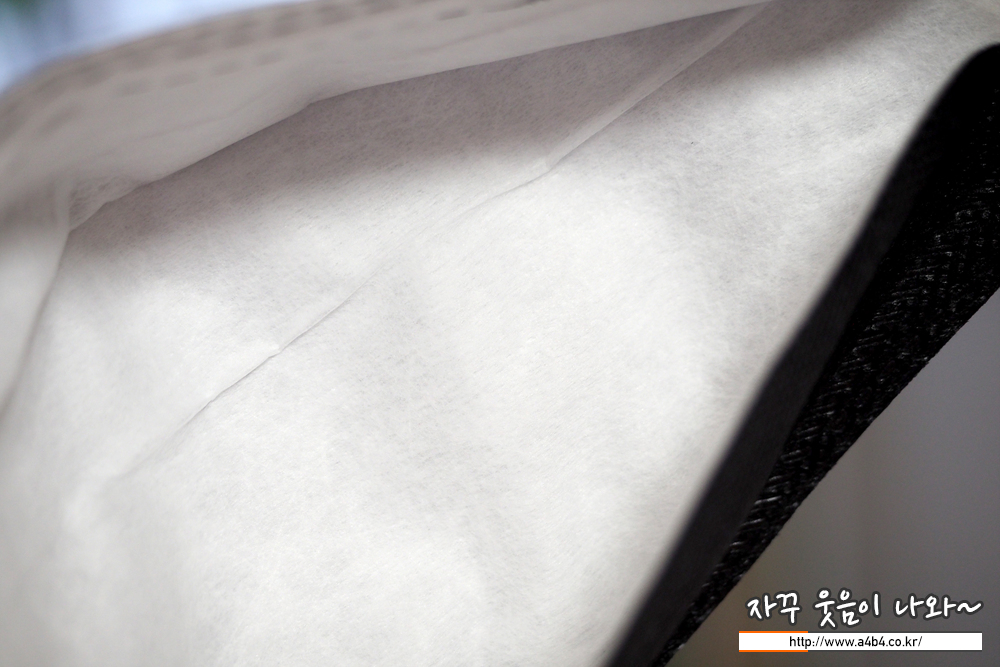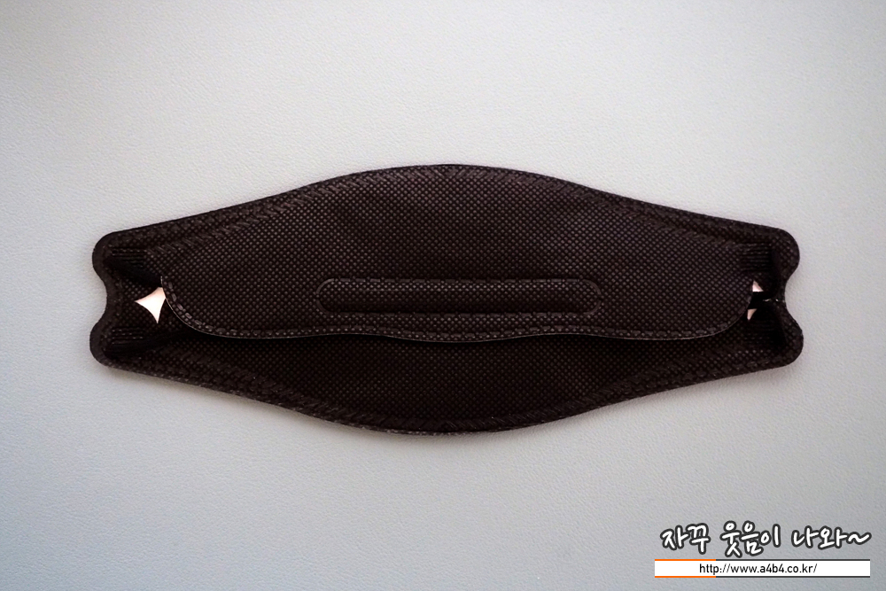 마스크 외피는 엠보싱처리된 매끈한 감촉의 부직포가 사용되었습니다. 마스크 발색은 유광블랙 타입으로 빛 조건에 따라 느낌차이가 생기는 제품입니다. (이 부분은 호불호가)