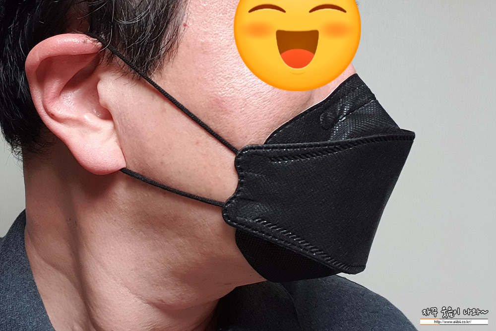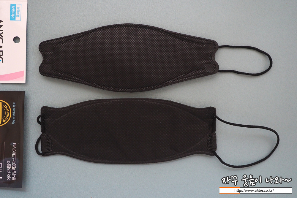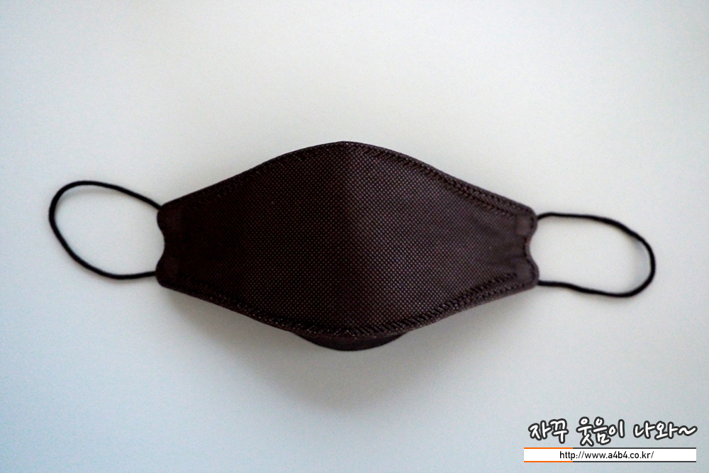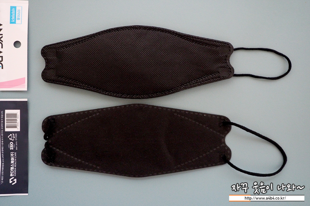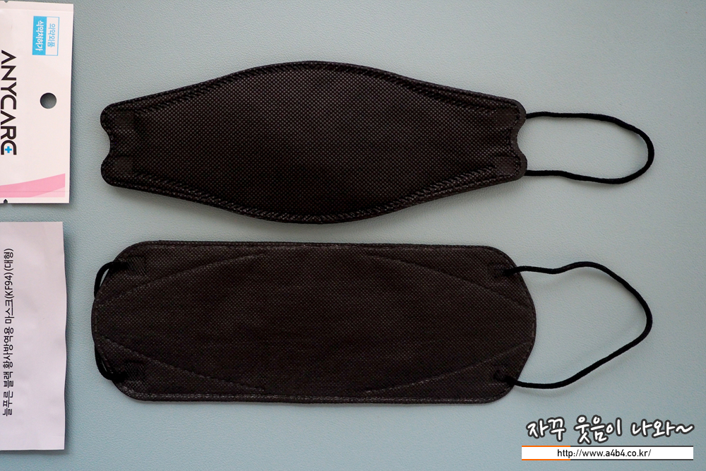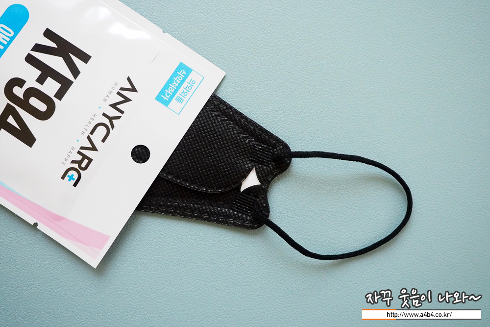 KF94 애니케어 마스크 블랙은 유광블랙 타입으로 빛반사가 조금 있습니다. 무광과 유광은 개인 선호도 차이로 보이고요. 얼룩없이 염색은 잘 되어 있네요. 조금 하드한 타입으로 마스크 착용핏은 잘 나옵니다.