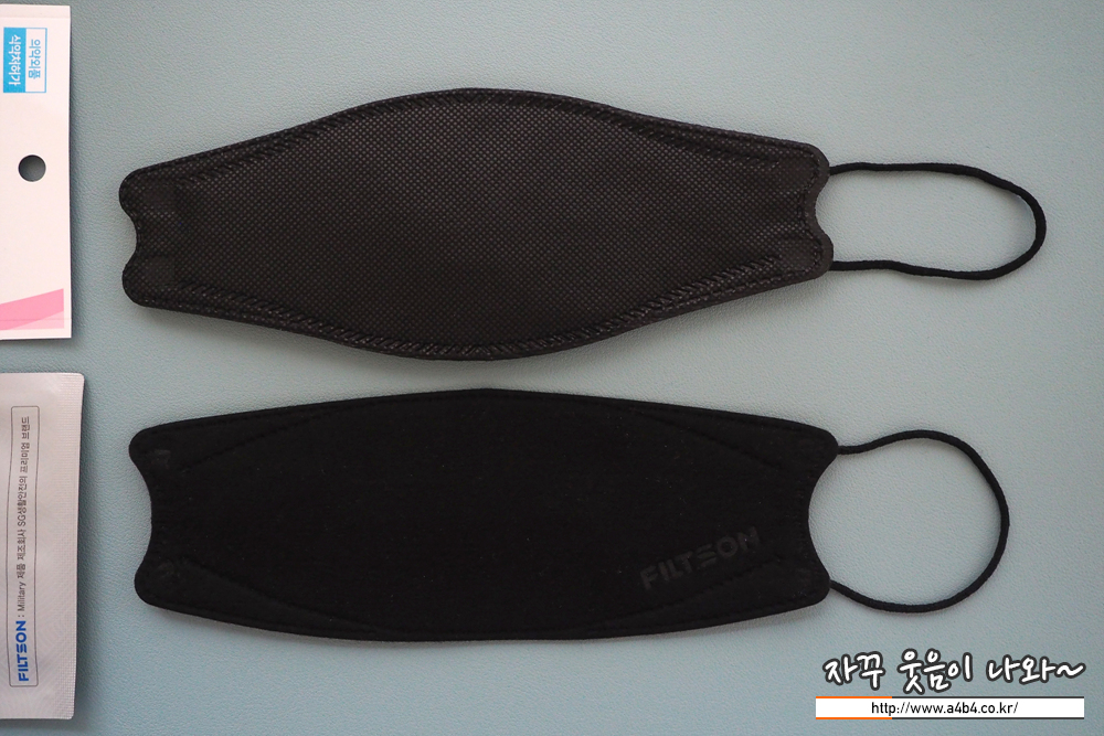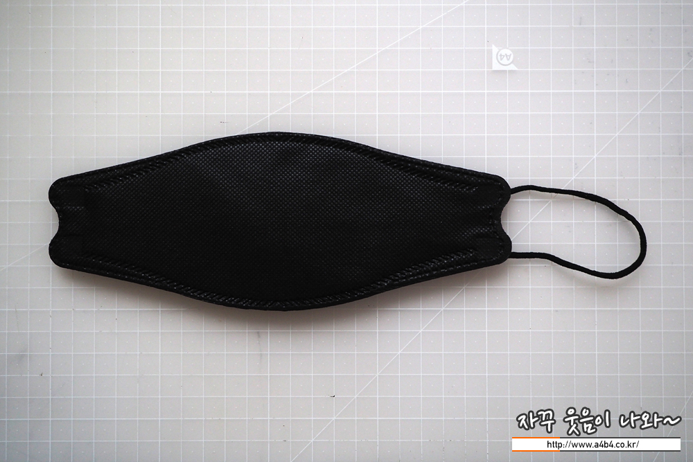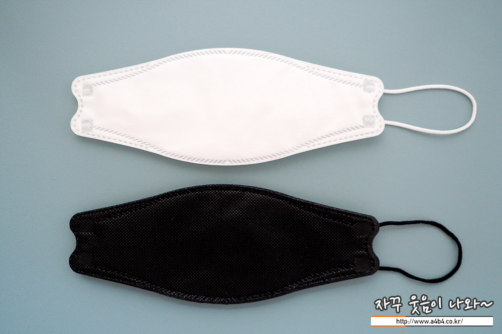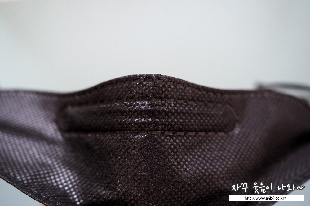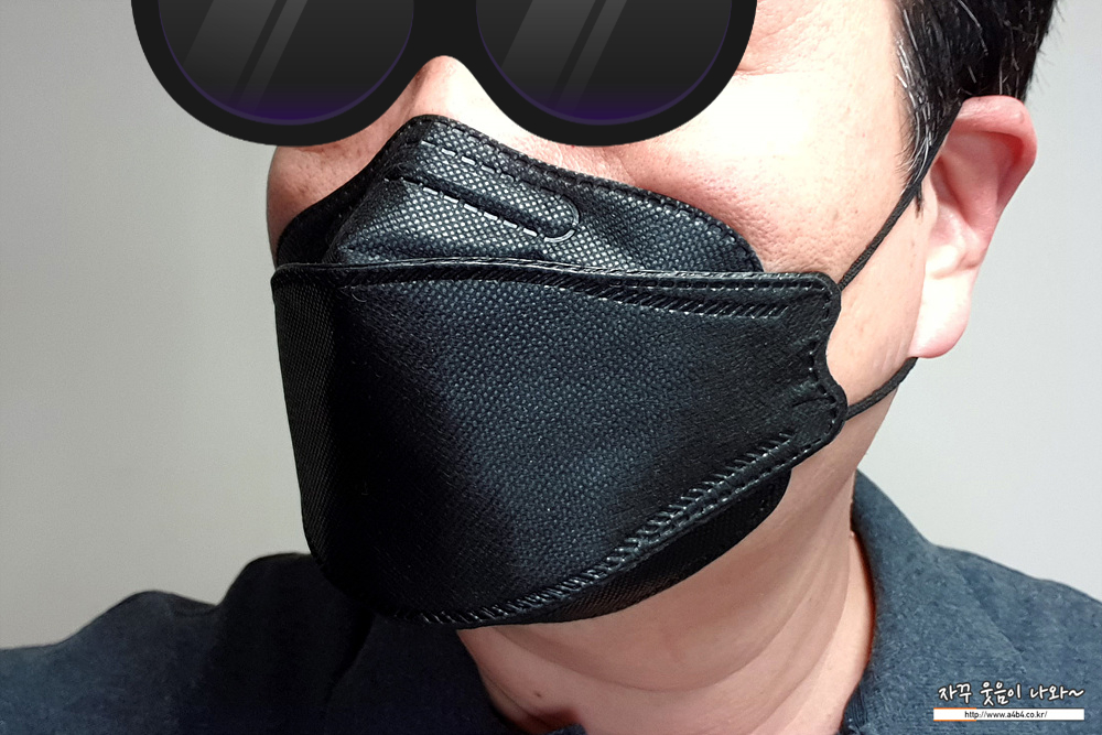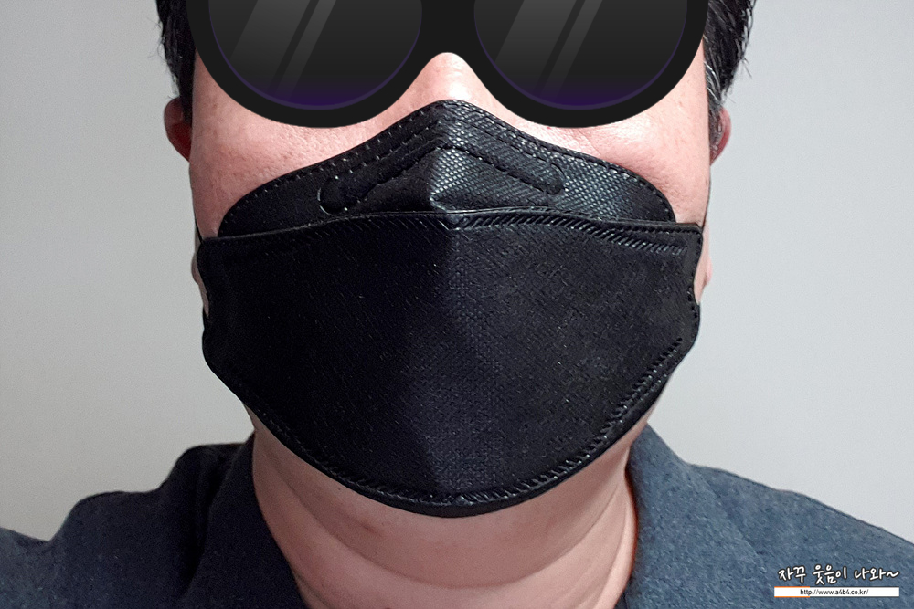 KF94 애니케어 마스크 블랙은 유광블랙 타입으로 빛반사가 조금 있습니다. 무광과 유광은 개인 선호도 차이로 보이고요. 얼룩없이 염색은 잘 되어 있네요. 조금 하드한 타입으로 마스크 착용핏은 잘 나옵니다.