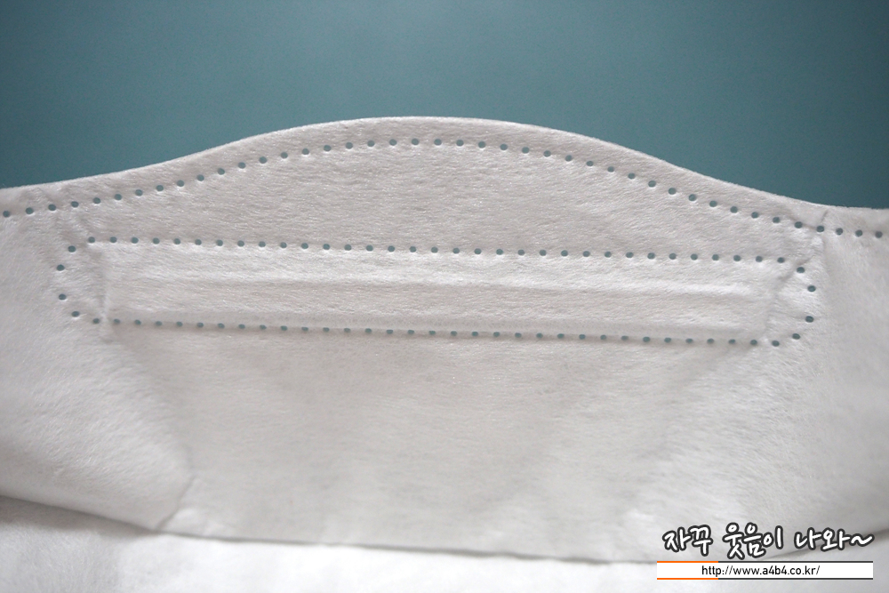마스크 겉감은 도트 마감된 드라이한 감촉의 부직포가 사용되었습니다. 일반적인 수준의 두께감을 보여주며 마스크 착용감은 하드한 타입으로 착용핏이 잘 나오는 제품입니다.