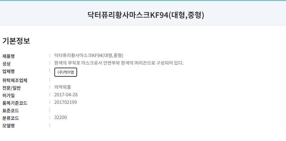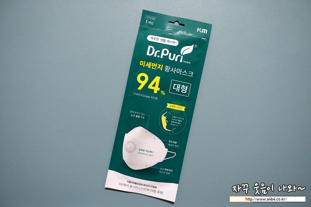 식품의약품안전처 의약품안전나라 등록명칭은 '닥터퓨리 황사마스크 Kf94'입니다. 오늘은 대형사이즈 흰색제품 리뷰합니다. 2017년 허가된 제품으로 마스크 제조원은 (주)케이엠입니다. 아에르 마스크를 생산하는 씨앤투스성진과 함께 코스닥에 상장되어 있는 업체입니다. 요즘 주가는 횡보하네요.