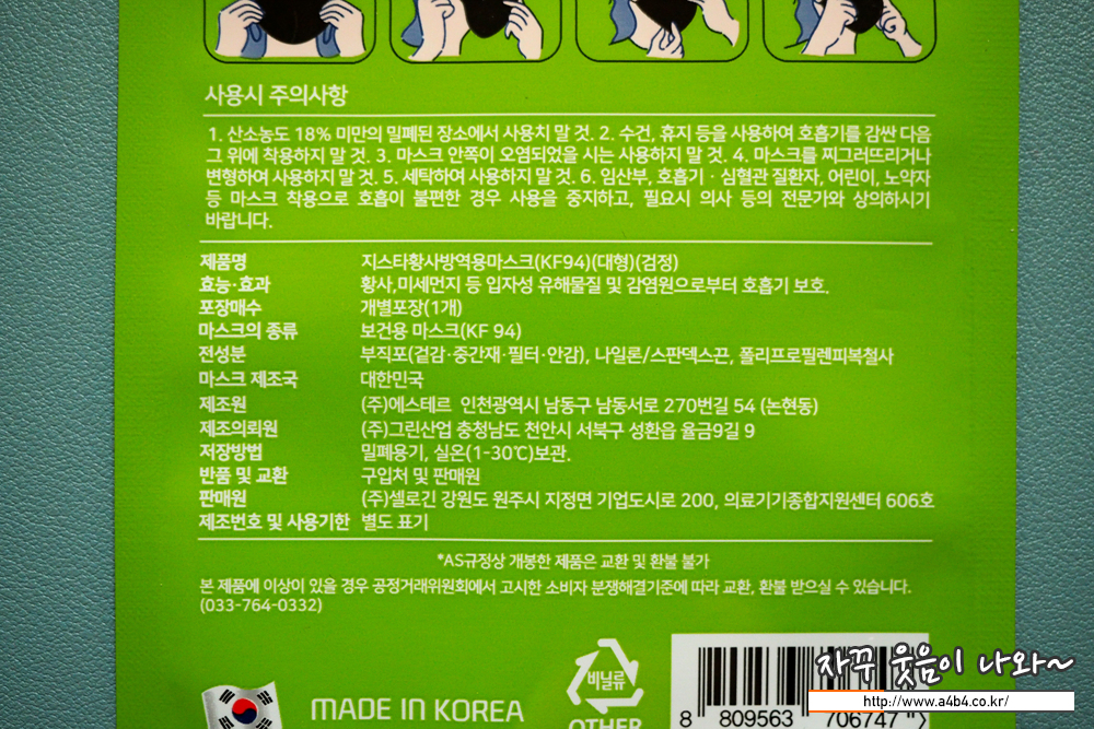 식품의약품안전처 의약품안전나라 등록 명칭은'지스타 황사방역용마스크'로 KF94 타입, 블랙 대형 마스크입니다. 제조원은 '(주)에스테르' 제조의뢰원은 (주)그린산업 입니다. 유통은 셀로긴에서 진행합니다. 작년 3월에 승인된 제품