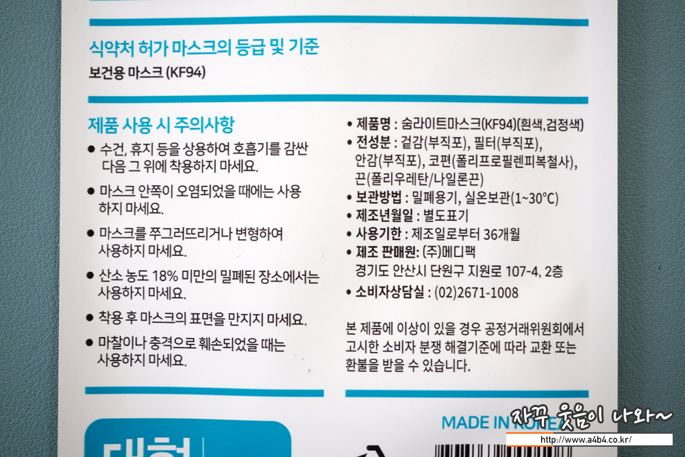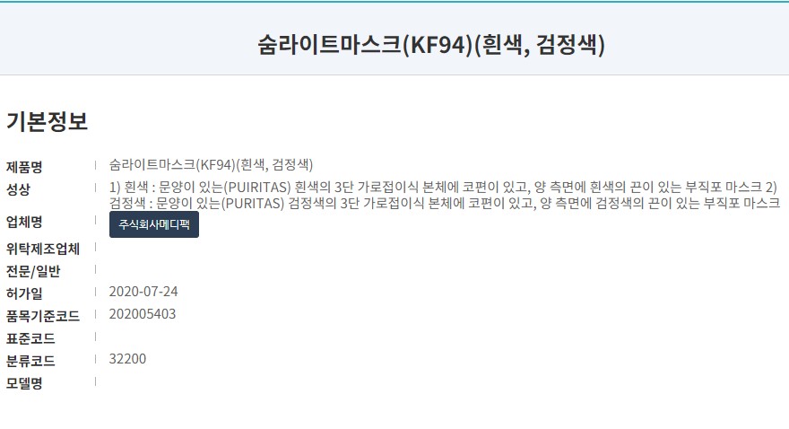 식품의약품안전처 의약품안전나라 등록명칭은 '숨라이트 마스크'로 KF94 타입의 제품입니다. 이름은 퓨리타스로 불리기도 합니다. 작년 7월 승인된 마스크로 제조원은 '(주)메디팩'입니다.
