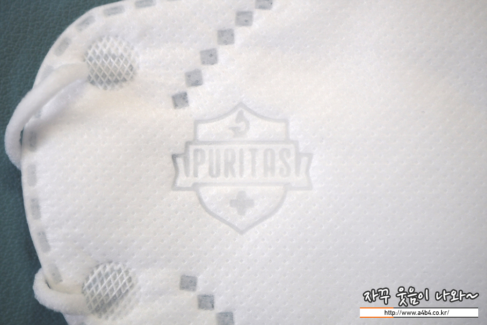 마스크 전면 우측 끝부분에는 방패모양의 심볼에 브랜드명인 퓨리타스(PURITAS)가 음각되어 있습니다. 잘못하면 상당히 지저부분한 처리가 될 수 있는데, 비교적 잘 표현되어 있습니다.
