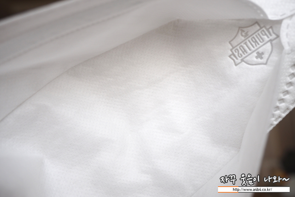 퓨리타스 마스크는 3중 필터구조로 마스크에 사용된 원자재는 모두 국산을 사용했다고 안내되어 있습니다. 마스크 내피는 부드러운 촉감을 보여주며 하루종일 사용하고 있어도 보푸라기가 생기거나 피부 트러블은 없습니다.