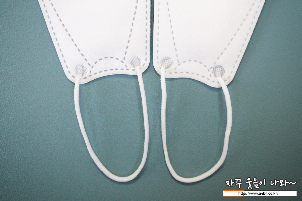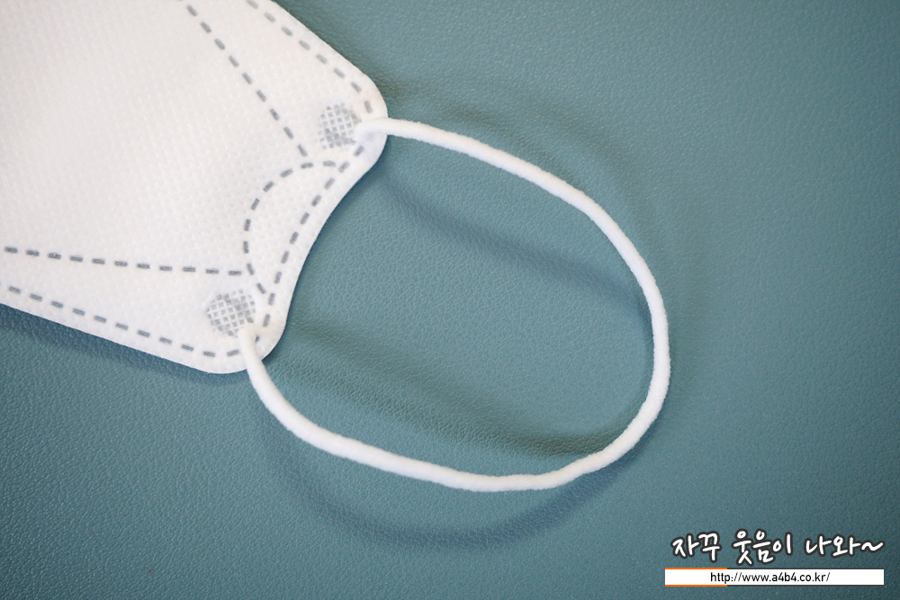 마스크 전면에 부착된 원형의 이어밴드 부착 상태는 양호하며, 이어밴드 탄력은 일반적인 타입입니다.