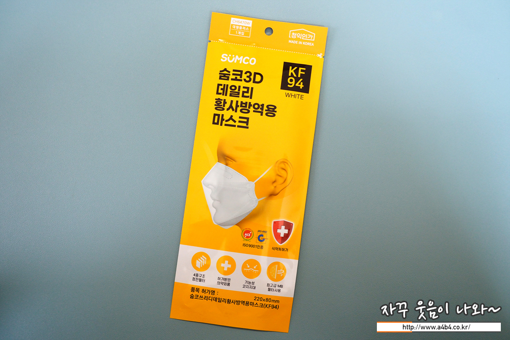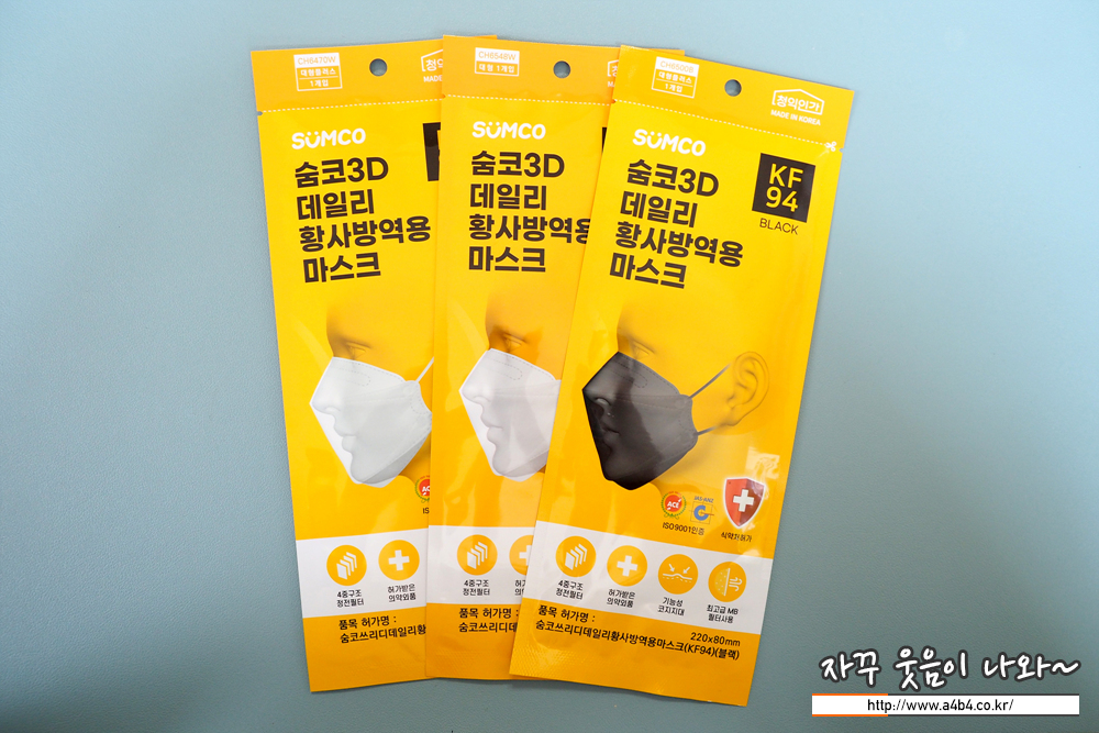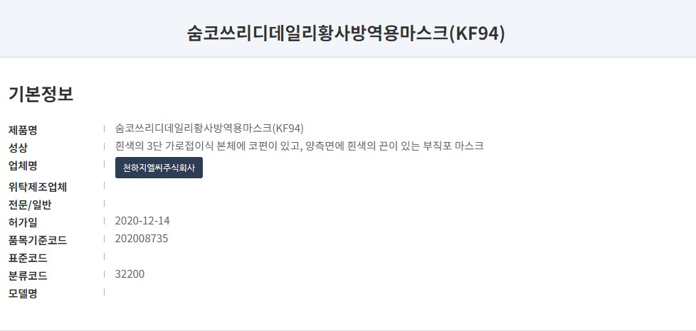 식품의약품 안전처 의약품 안전나라 등록명은 '숨코 쓰리디 데일리 황사방역용마스크'로 KF94, 대형 플러스 제품입니다. 작년 12월 식약처 승인된 정말로 따끈한 신상 마스크입니다. 마스크 제조원 및 유통은 '천하지엘씨(주)'입니다.