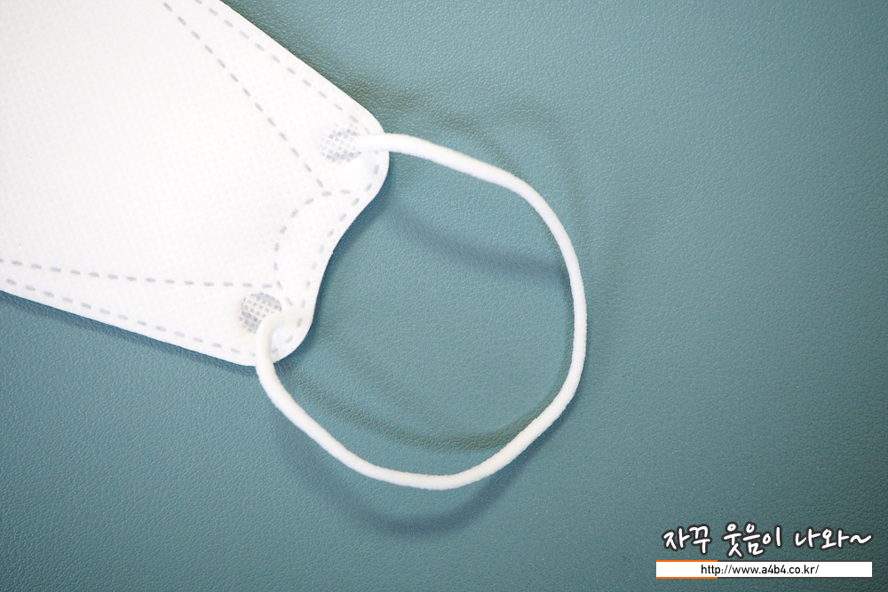숨코 마스크 대형+는 둥근 모양의 귀걸이끈이 사용 되었으며, 마스크 앞부분에 부착되어 있습니다. 귀걸이끈 탄력은 타사 제품과 비슷한 수준입니다.