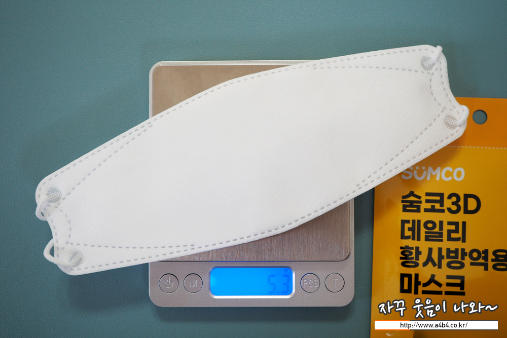 KF94 숨코 마스크 대형 플러스 중량은 5.3그램으로 타사 제품에 비해 중량이 조금 나가는 제품입니다.