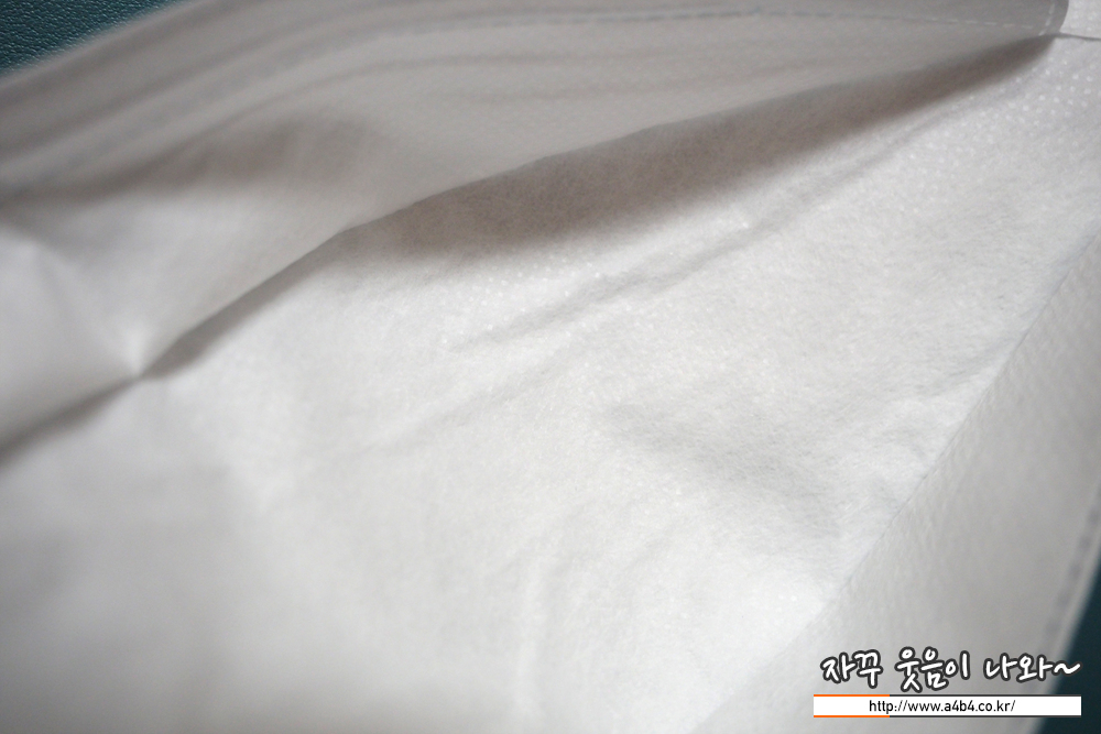 클린온 마스크 대형은 4중 필터구조로 엠보싱 처리된 드라이한 감촉의 부직포가 외피로 사용 되었습니다. 두께는 얇은 편이며, 두께에 비해서 하드한 타입의 제품입니다.