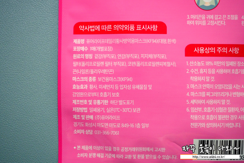 식품의약품안전처 의약품안전나라 등록명칭은 '퓨어라이프데일리 황사방역용마스크 (KF94)'로 대형, 흰색 마스크입니다. 작연 10월 승인된 마스크로 주식회사 퓨어라이프에서 제조 및 판매하고 있습니다.
