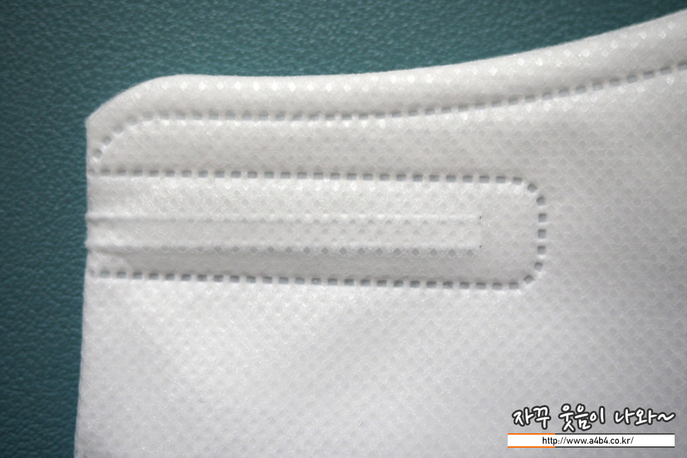 성상 흰색의 2단 세로접이식 본체에 코편이 있고, 양 측면에 흰색의 끈이 있는 부직포 마스크