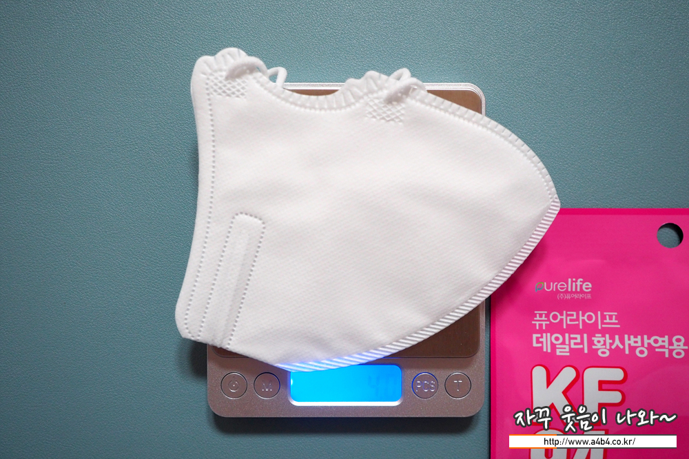 퓨어라이프 KF94 데일리 마스크 중량은 4.0그램으로 유명 새부리형 대형 마스크 중에서는 가벼운 중량의 마스크입니다.