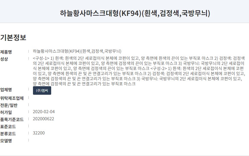 식품의약품안전처 의약품안전나라 등록명칭은 '하늘황사마스크'로 KF94 대형사이즈입니다. 작년 2월 승인된 마스크로 제조업체는 (주)엠씨입니다. 참고로 아동용 컬러마스크로 잘 알려진 꼼마꼼마 마스크를 제조하는 곳입니다.