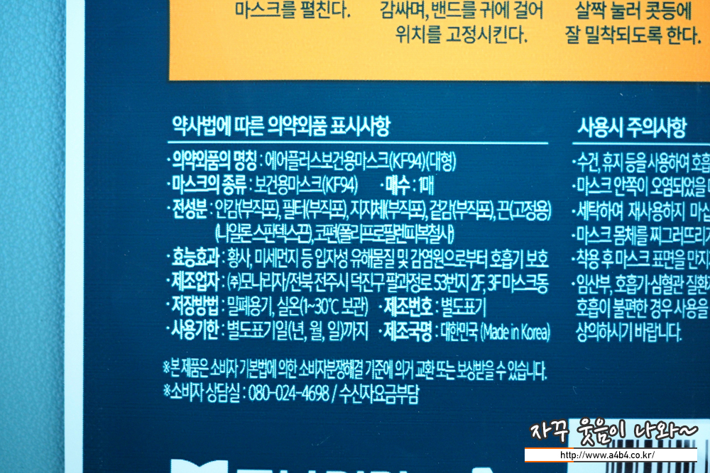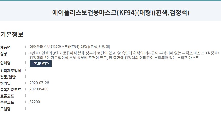 식품의약품 안전처 의약품안전나라 등록명칭은 '에어플러스보건용마스크'입니다. 오늘 리뷰할 사양은 KF94 대형이며 작년 7월에 승인된 제품입니다. 마스크 제조원은 (주)모나리자입니다. 모나리자에서 생산하는 마스크 정보는 해당글 맨 하단에 정리되어 있습니다.