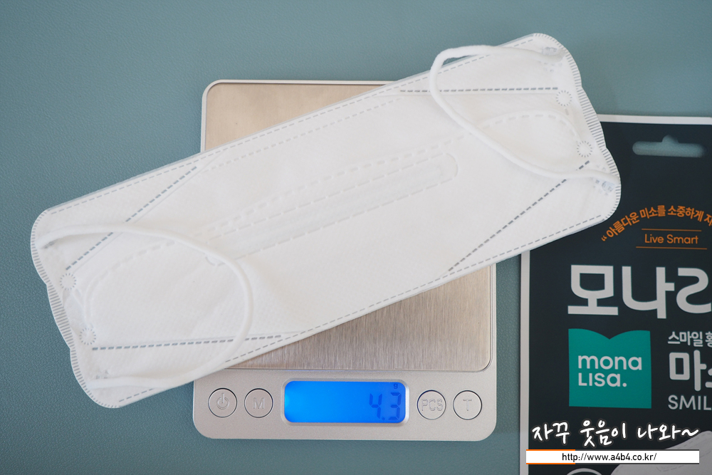 KF94 모나리자 마스크 대형 중량은 4.3그램으로 일반 대형사이즈 마스크 중에서는 약간 가벼운 중량입니다.