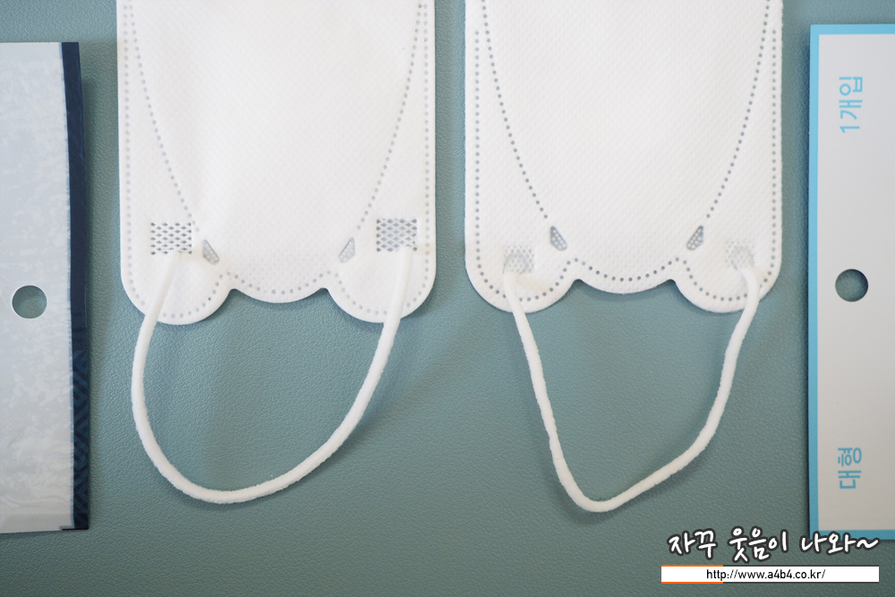 마스크 앞면에는 원형의 귀걸이끈이 접착되어 있습니다. 귀걸이끈 탄성은 조금 약한 수준이네요. (잘 늘어난다는...)