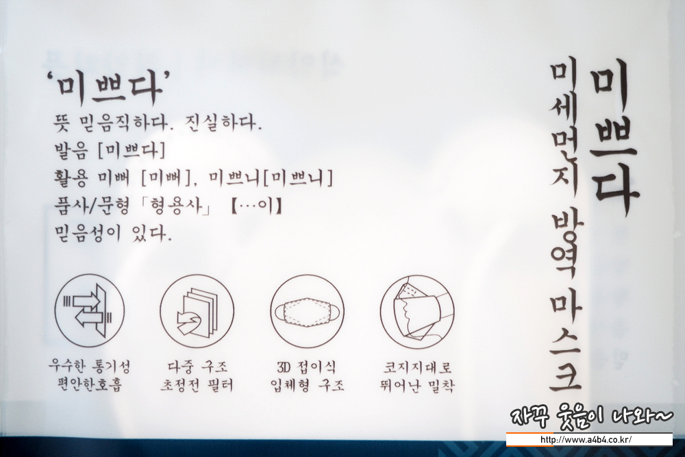 오늘 리뷰할 마스크는 참신한 네이밍과 디자인을 보여주는 KF94 입체형 마스크인 '미쁘다 마스크' KF94 대형 리뷰입니다. 특히 같은 제조사인 '에프씨팩토리'에서 판매하는 '클린 마스크'와 비교리뷰 합니다.