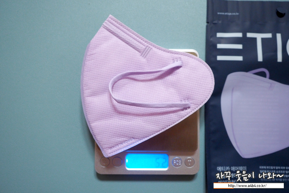 에티카 에어웨이 마스크 중형 사이즈 무게는 5.2그램으로 새부리타입의 KF 중형 보건용마스크와 비교해서는 무게가 조금 나가는 제품입니다.