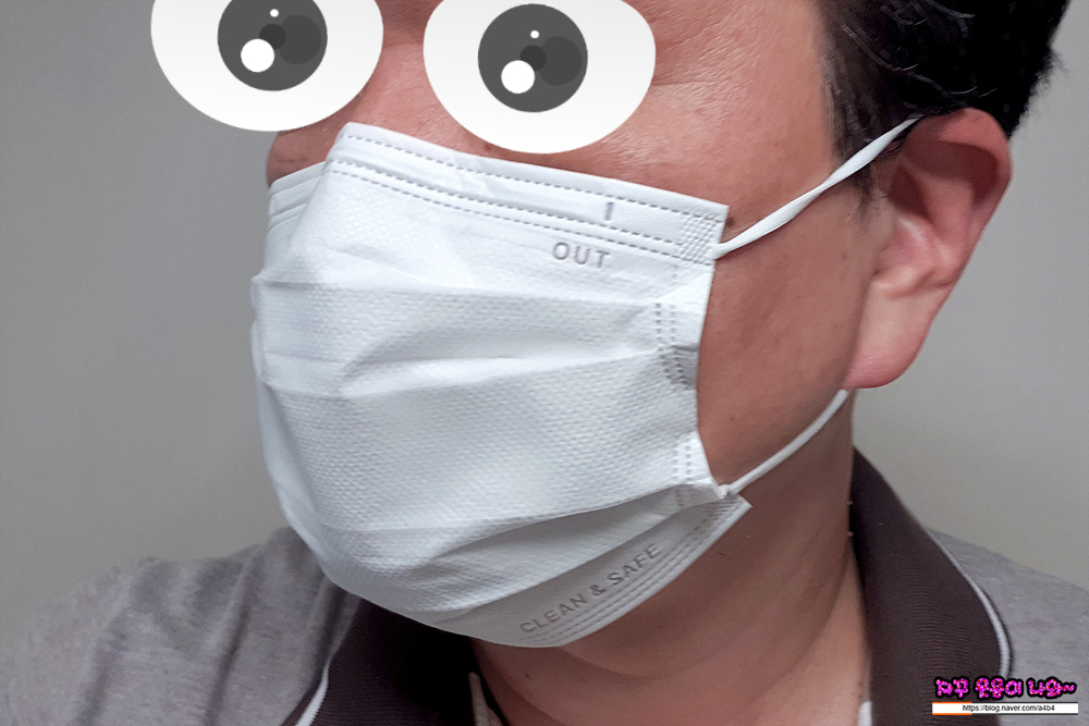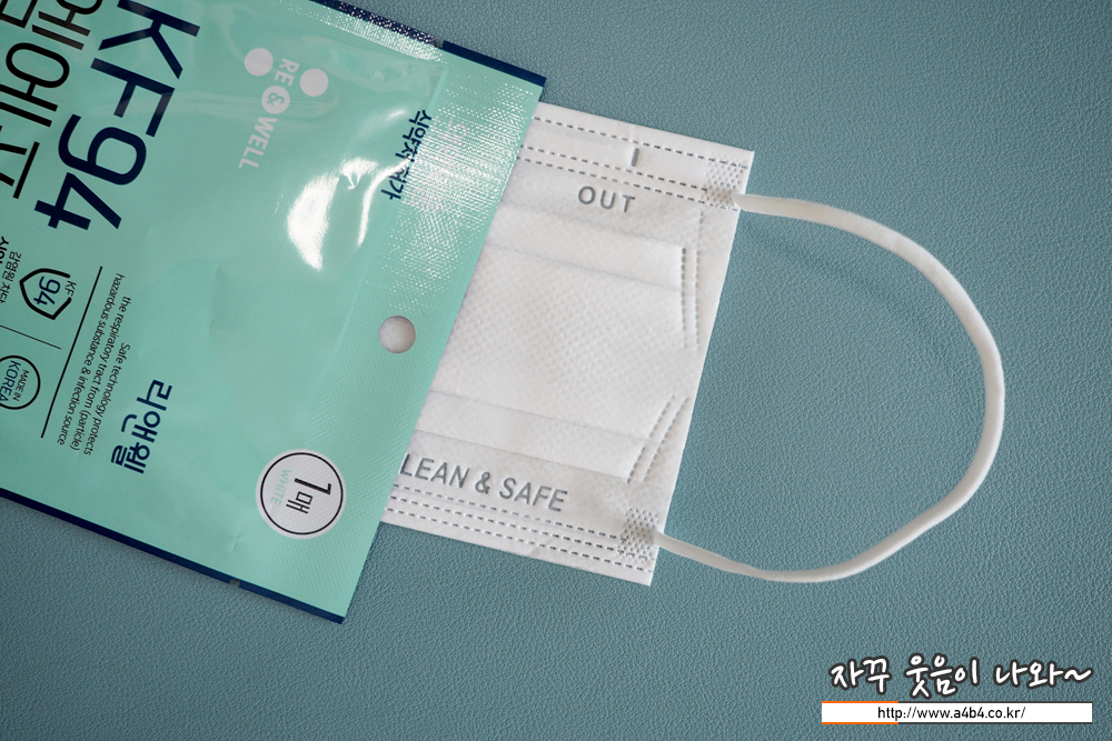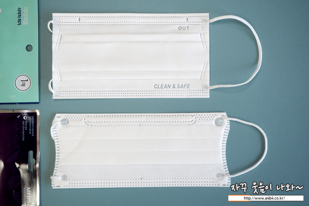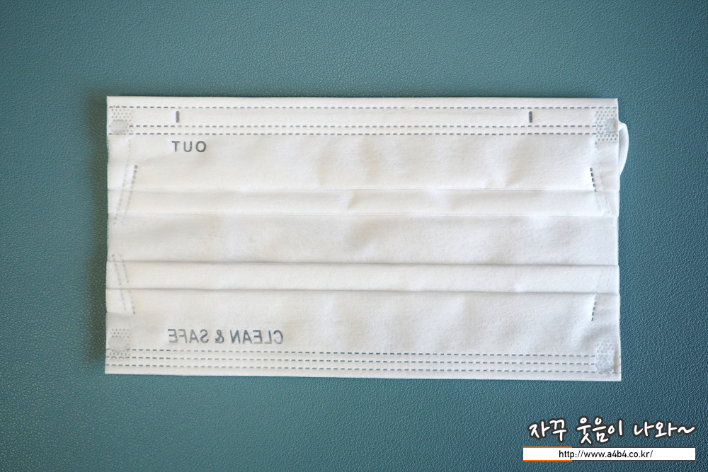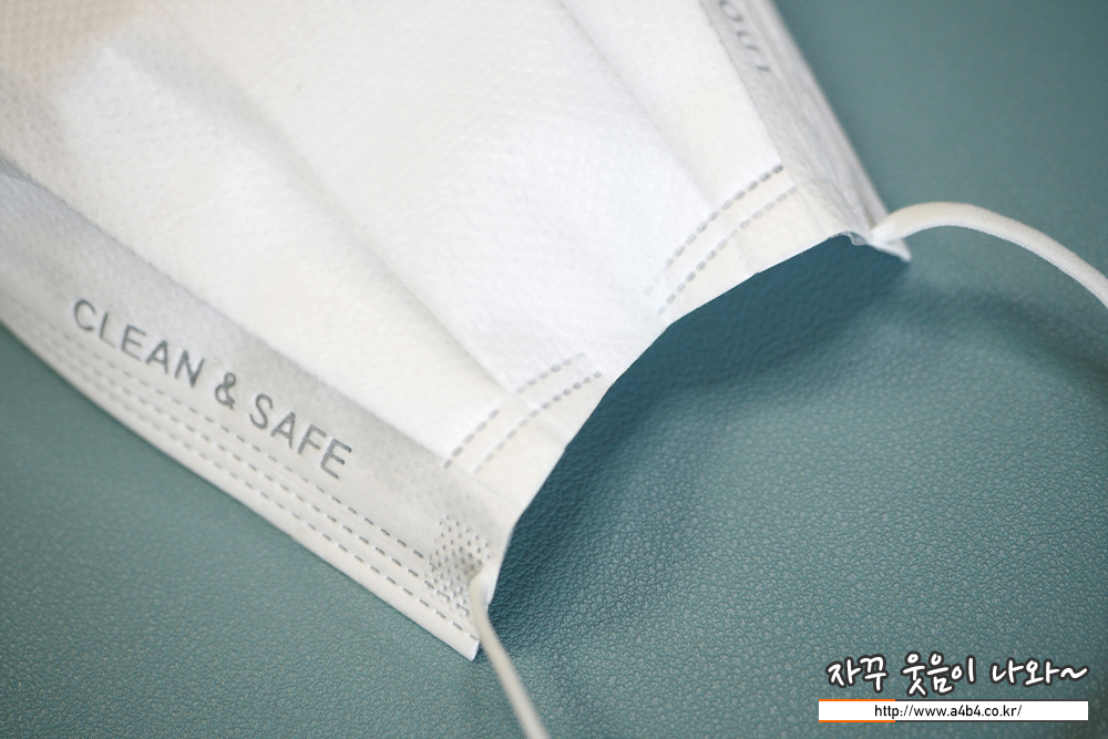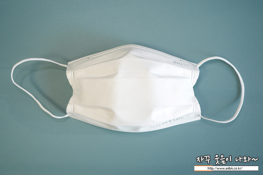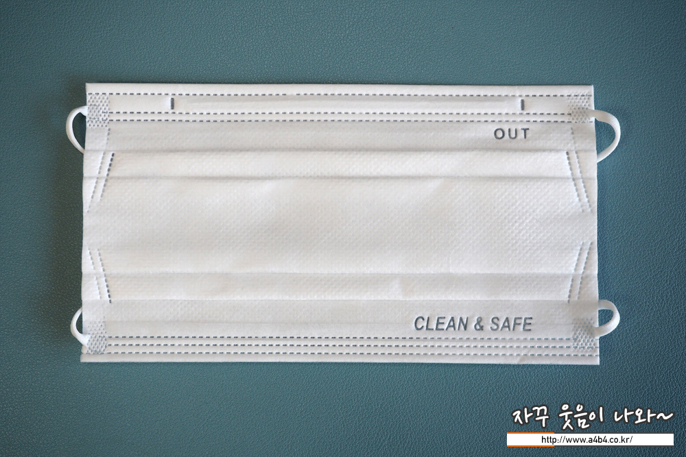 마스크 하단에는 클린 & 세이프 문구가 영문으로 표시되어 있으며 마스크 앞면을 표시하는 OUT 문구가 있습니다.