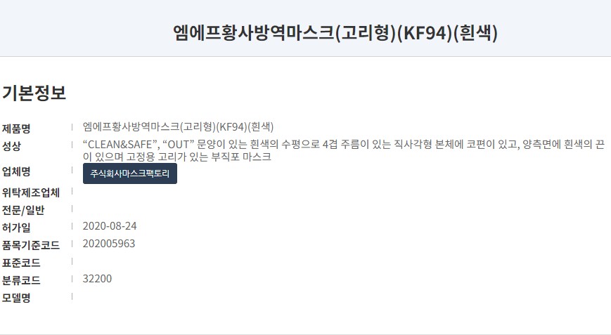 식품의약품안전처 의약품 안전나라 등록명칭은 '엠에프황사방역마스크'입니다. 대형사이즈 KF94 타입으로 작년 8월에 승인된 마스크입니다. 제조사는 '주식회사마스크팩토리'로 엠에프 이름으로 여러 타입을 생산하고 있습니다.