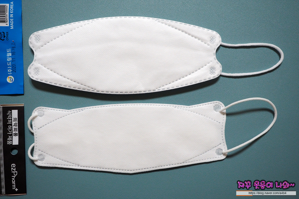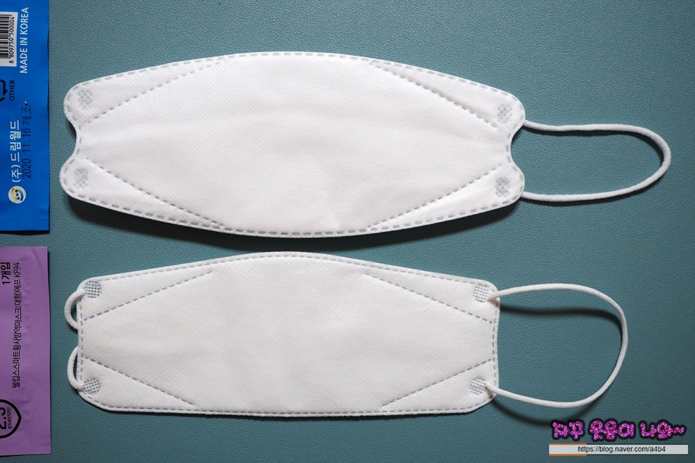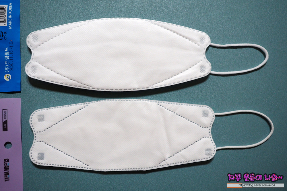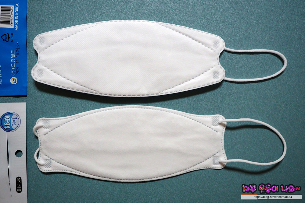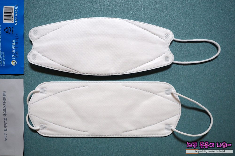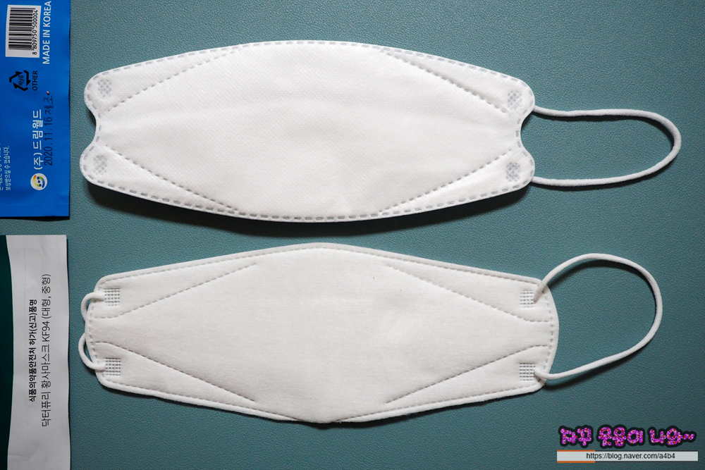 드림 KF94 마스크는 매끄러운 감촉의 부직포가 겉감으로 사용되었습니다. 두께는 조금 얇은 타입으로 마스크 착용감은 소프트한 스타일을 보여줍니다.