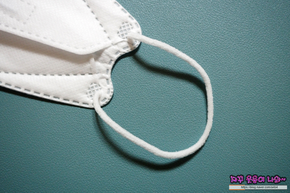 둥근모양의 귀걸이끈은 마스크 후면에 접착되어 있으며, 접착 상태는 양호합니다. 귀걸이끈 탄력은 약한 타입입니다.
